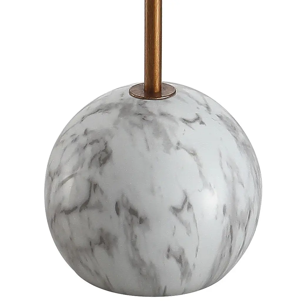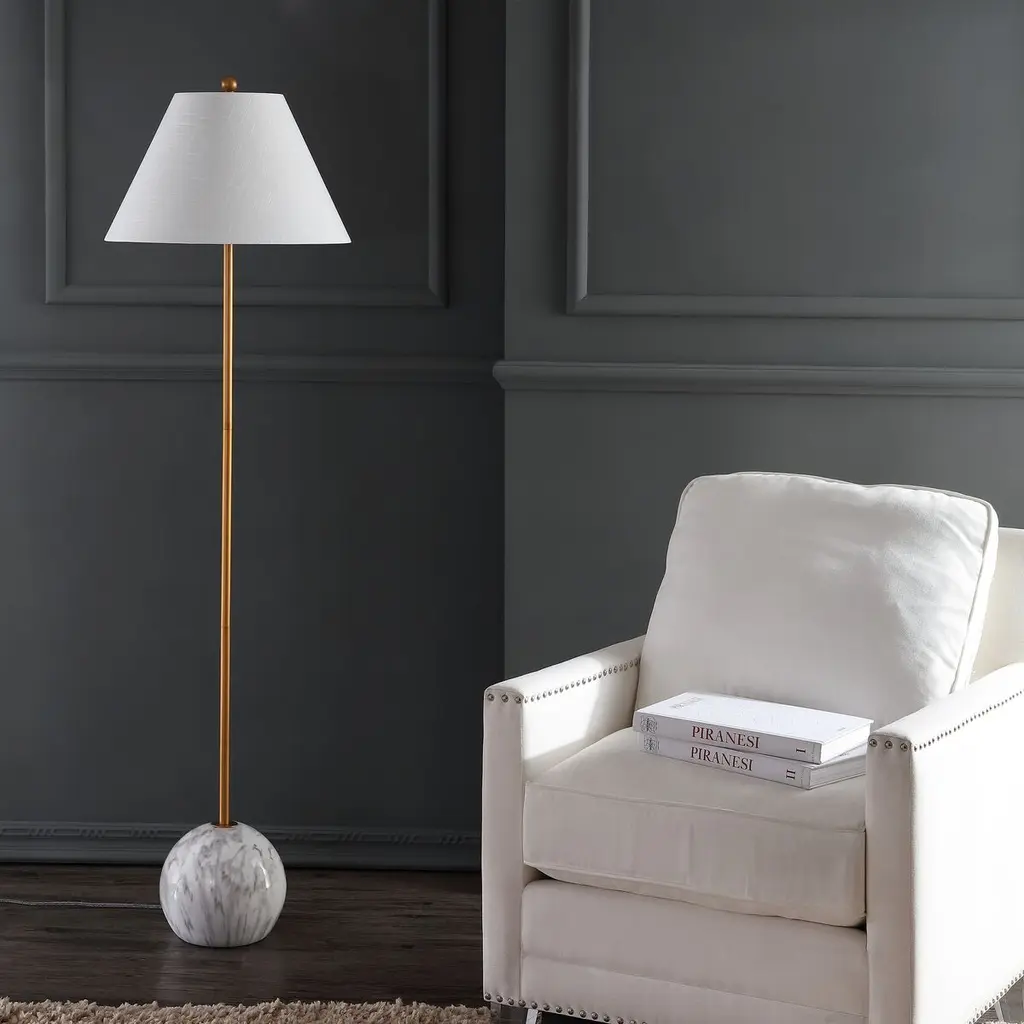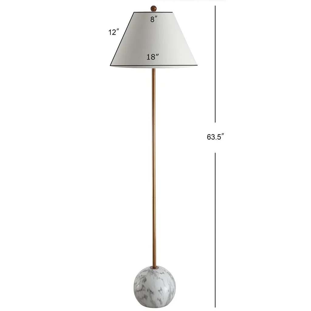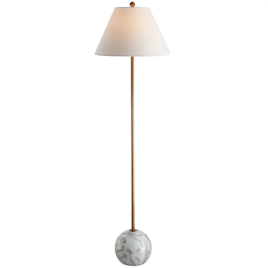 Don't tell anyone, but this floor lamp's globe-shape base is made of cast resin rather than marble. The gleaming brass stem, the linen shade, and the silk-wrapped cord accentuate the luxurious look.