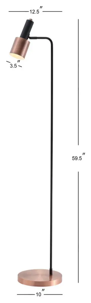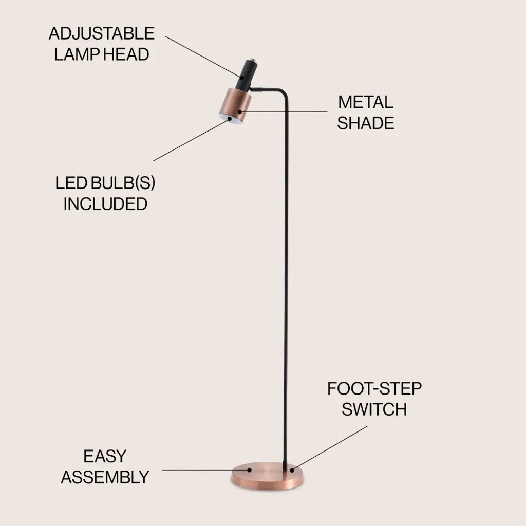 Boasting a refined mid-century-modern style inspired by vintage Hollywood decor, this unique task floor lamp connects a sleek curved pedestal with a shapely task shade. Compact to save space on busy workstations, its black and copper shade features a white interior to maximize the light. With a matching weighted base, the completed look is both elegant and modern. Features:Perfect for a desk, the light is appropriately angled to illuminate a work space On-off foot-step switchEco-friendly 4W LED bulb includedTakes one bulb and compatible with any 9W LED or 40W TYPE "A" or 13W CFLUL Listed Color: Copper/BlackBody Material: MetalIncludes: One (1) lampAssembly RequiredDimensions:Lamp: 59.5 inches high x 12.5 inches wide x 10 inches deepAbout us:You see a lamp.We see a decorative work of art.A perfectly curved shade casts a dramatic shadow on a floor. Compatible with LED lightbulbs: as easy on the environment as they are on the eyes. The JONATHAN Y Lighting collection considers every detail from impeccably sourced materials to designer styling. And our prices are so attractive, we''ve transformed a functional necessity into a fashion accessory.JONATHAN Y Lighting - a fashion revolution in home decor.