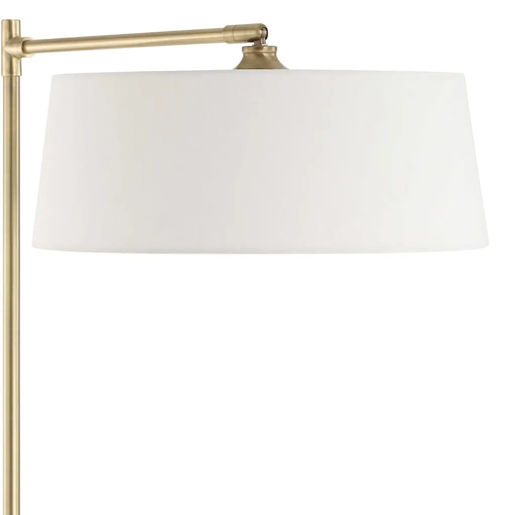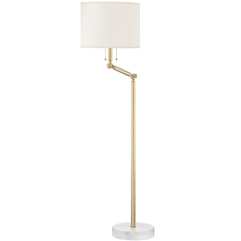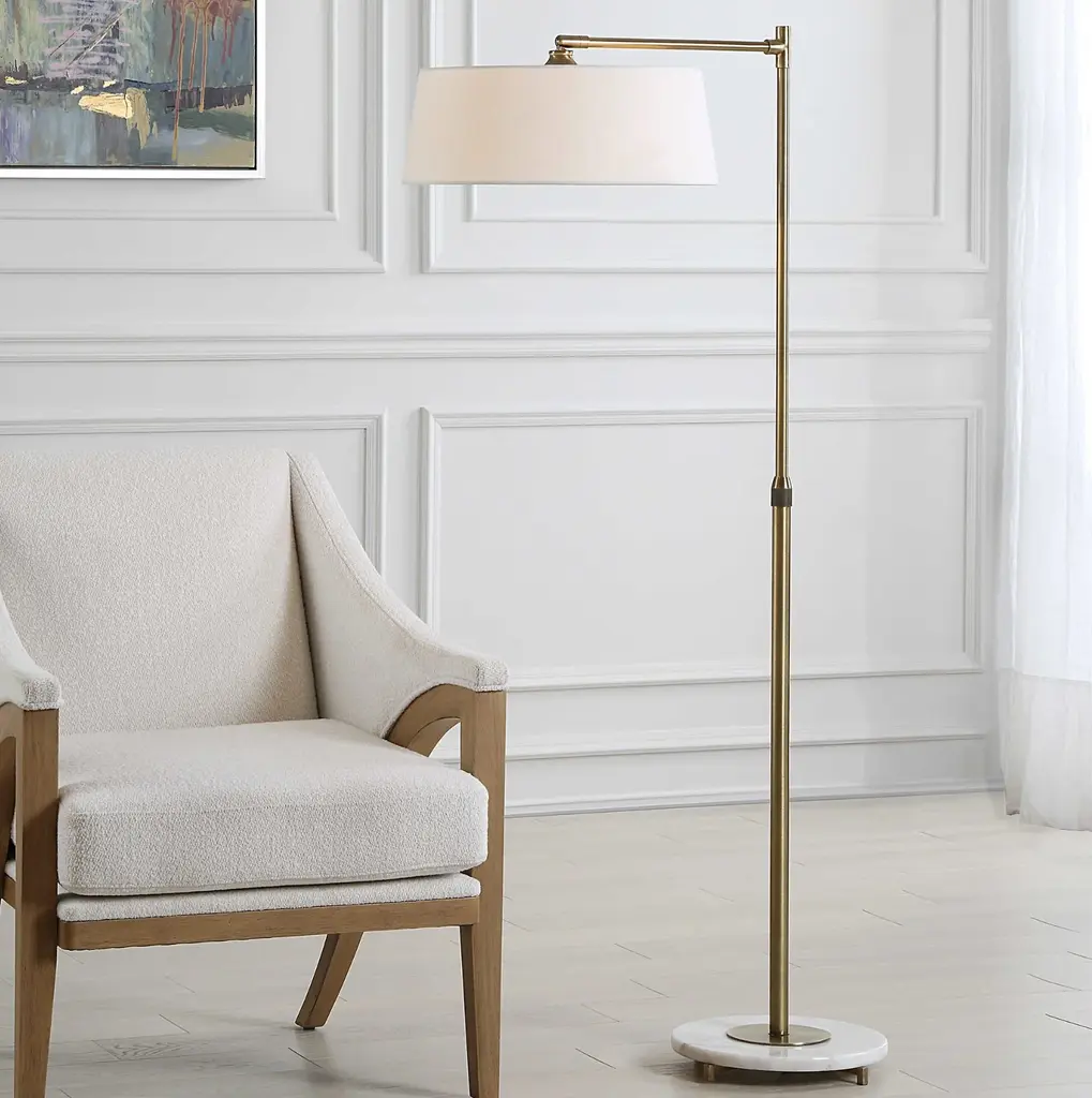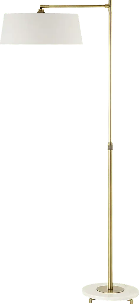 The Branch Out floor lamp features a telescoping neck that can adjust its height from 48" as a reading lamp to 67" as a floor lamp. Made of iron with a plated antique brushed brass finish, it is supported by a white marble base. The lamp's pivoting stem holds a slightly tapered white linen hardback shade for a modern touch.