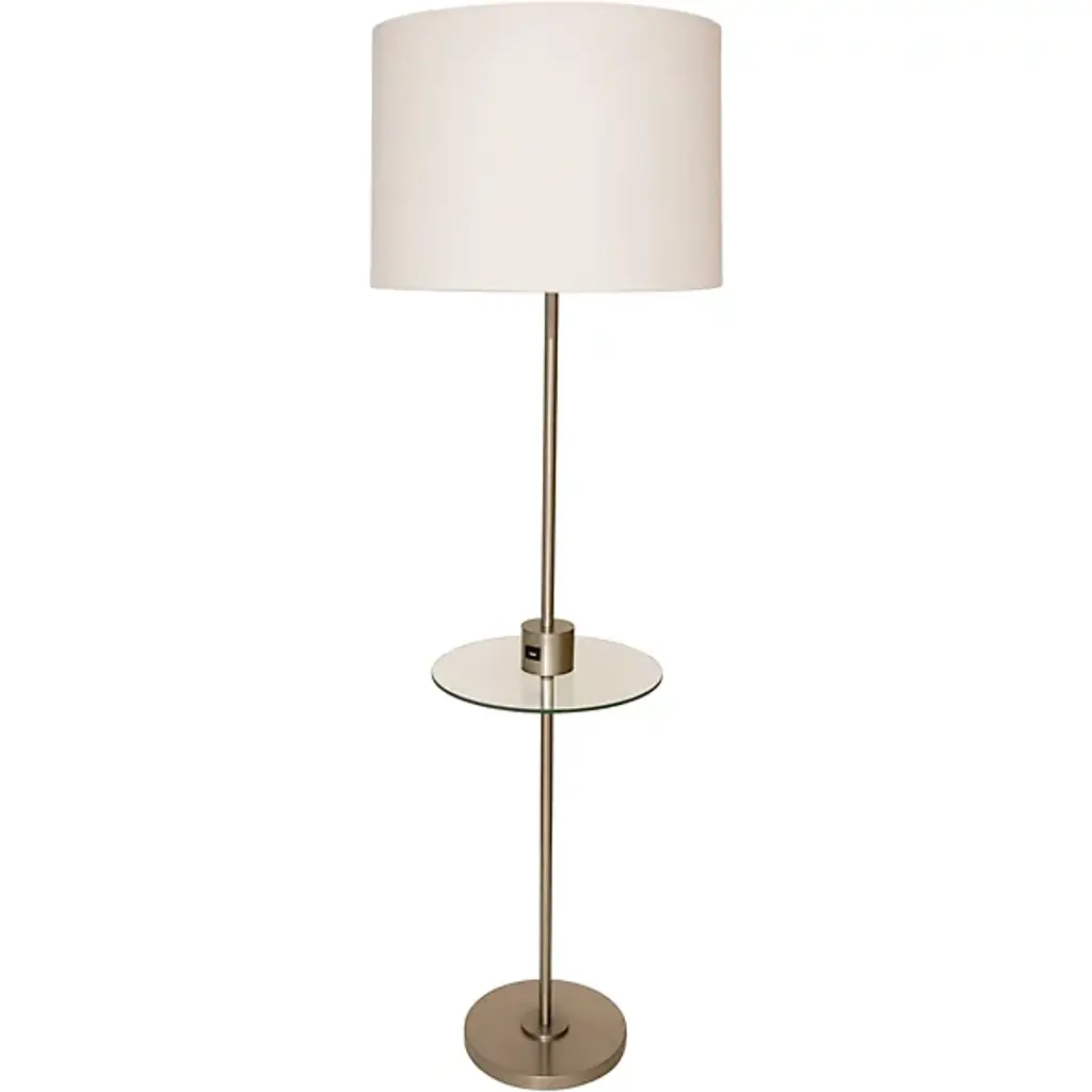 The Brandon Floor Lamp by House Of Troy offers classic elegance combined with modern-day functionality. A circular metal base supports its slender body as it extends upward to a transparent glass mini table with a built-in USB port, offering the perfect resting place for charging devices. Its body continues upward to a hardback linen drum shade, concealing its lamping and diffusing its glow for a soft and pleasant illumination that harmonizes with any décor.