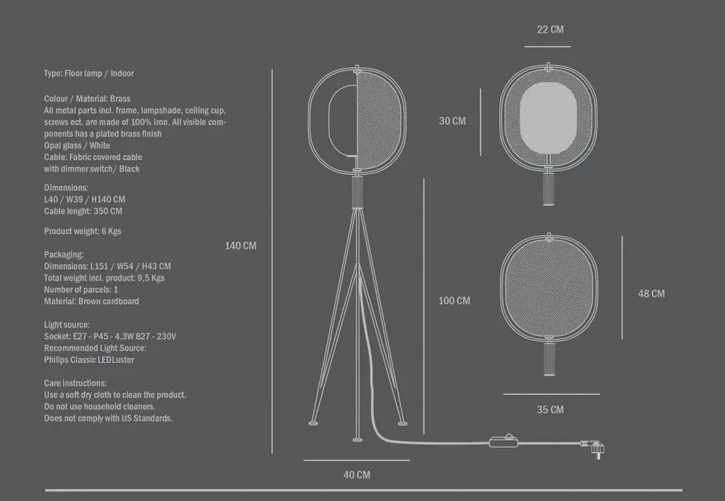Brass floor lamp, contemporary work.This contemporary floor lamp is a collection of lamps inspired by ancient Japanese lanterns. The opal glass lantern-shaped light source is half-hidden behind a flexible metal screen. The perforated metal screen filters the light and can be rotated to create unique lighting installations. The shade is mounted on an elegant metal frame, adding a certain lightness to the lamp. Colour/material: gold-coloured metalAll visible components have a gold metal finishOpal glass / whiteCable: Fabric-covered cable with dimmer / blackDimensions:L: 40 cm / W: 39 cm / H: 140 cmCable length: 350 cmProduct weight: 6 kg