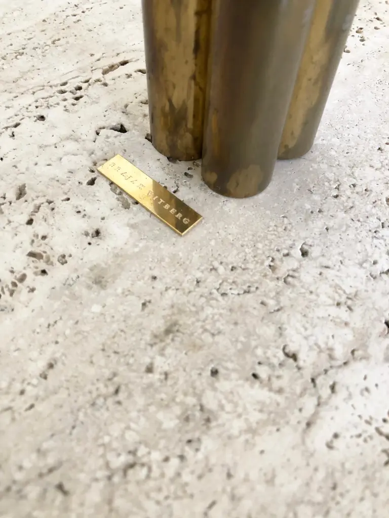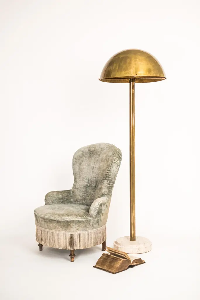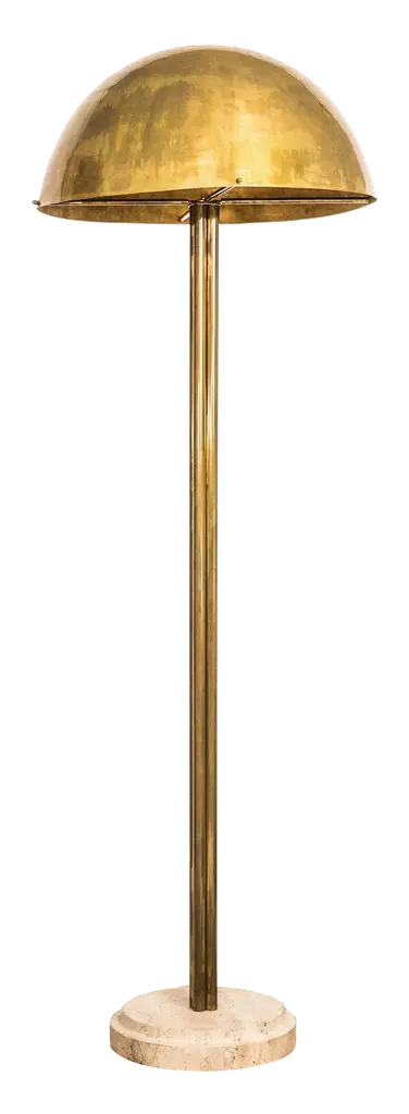 Brass sculpted floor lamp "Art Deco" by Brajak VitbergMaterials: travertine, aged brassDimensions: Ø: 34 cm h: 8 cmAged brass lampshade: Ø: 60 cm, h: 120 cm6 - 8 week productionBijelic and Brajak are two architects from Ljubljana, Slovenia.They are striving to design craft elements and make them timeless through experimental designing process.The studio creates a range of products from handmade and limited small series to one piece unique products, inspired by materials and forms that create incomplete perfection.All our lamps can be wired according to each country. If sold to the USA it will be wired for the USA for instance.