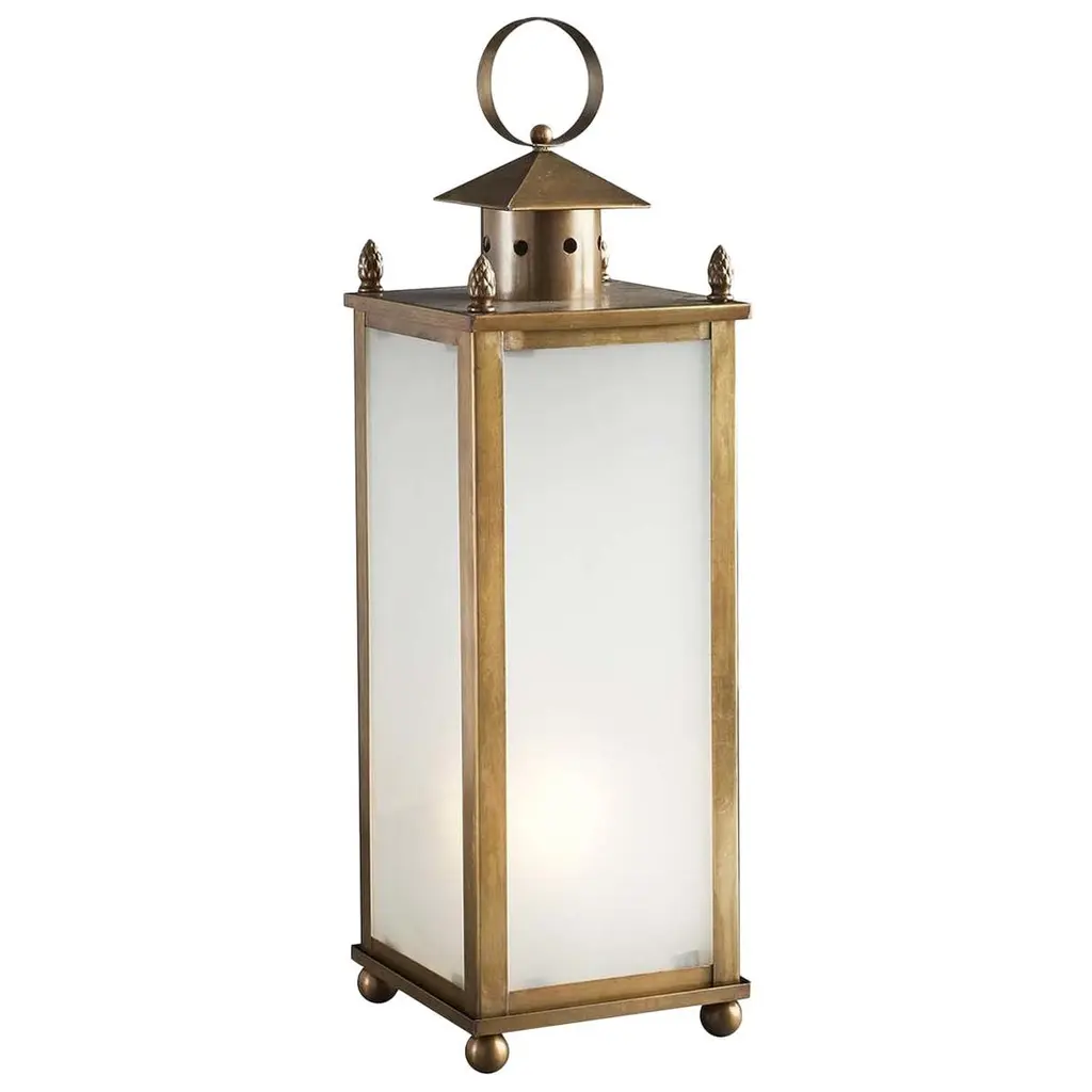In rich brass, the Brassy Outdoor Floor Light adds a magical touch to a deck, pool area or front porch. Crafted in brass with frosted glass panels, the lantern features charming decorative pinecones on each corner. The lantern comes in electric and candle versions.\nBulb (electric version): 1 x E27.