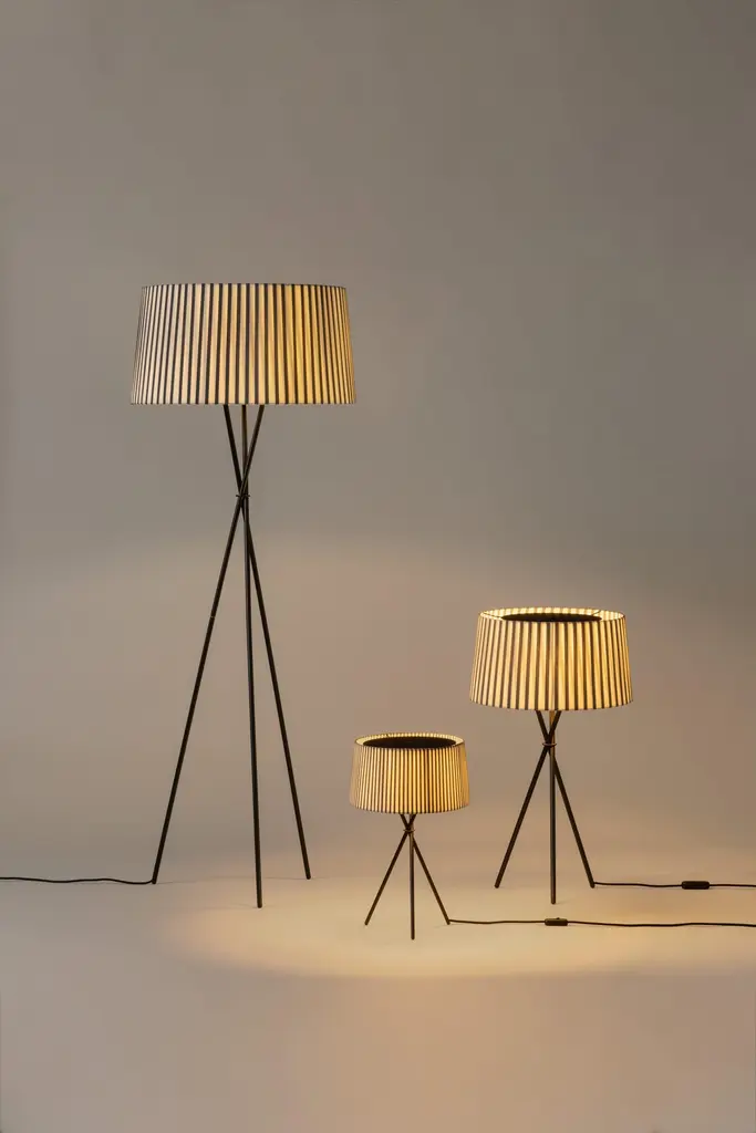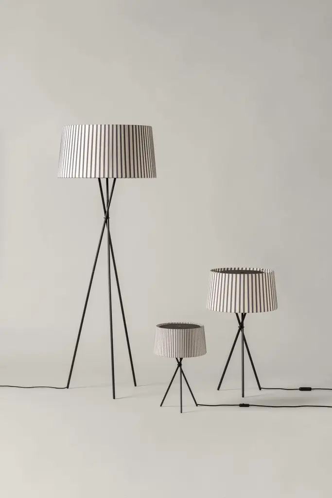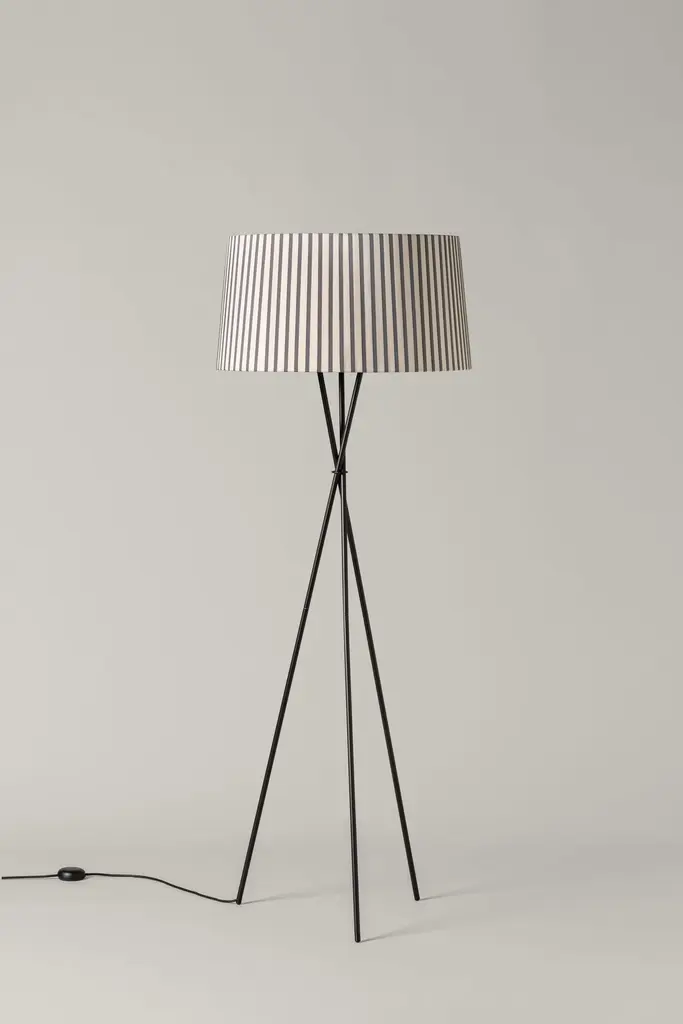 Bretona Trípode G5 floor lamp by Santa & ColeDimensions: D 62 x H 168 cmMaterials: Metal, bretona stripe ribbon lampshade.Available in other colors.Trípode humanises neutral spaces with its colourful and functional sobriety. The shade is hand ribboned and its base could not be more stable. Switched on, it provides a characteristic, warm light, rich in nuances. Switched off, it is a small volumetric sculpture that invites immediate use.Dimmer included.Santa & Cole is a small, independent and global editor of design products, with its roots in Belloch (Barcelona, Spain). We have been editing since 1985, when the company was first founded. By editing we mean preparing a work for the public domain, we mean adapting an item for everyone’s use. What a book editor does with stories, we do with objects.More than eighty creators have contributed to a rich catalogue of furniture and lighting products originating in very different contexts, by renowned designers such as Antoni Arola, Miguel Milá, André Ricard and llmari Tapiovaara.Acute and attentive to quality and detail, Santa & Cole outsources all of its industrial production to an extensive network of suppliers, mainly in Spain, but also in other countries such as Japan, where the washi paper for our Tekiò lamp is made.Our mission is to build, safeguard and disseminate knowledge through design objects. Objects whose quality is recognisable at the touch of a hand, and that enrich people’s lives, whether at home or in shared environments. Our philosophy is more modern than futurist and we are more intrigued by silence than by stridency.Our focus is not the present market, but the future one; not Barcelona, but the world; not fashion, but history.All our lamps can be wired according to each country. If sold to the USA it will be wired for the USA for instance.