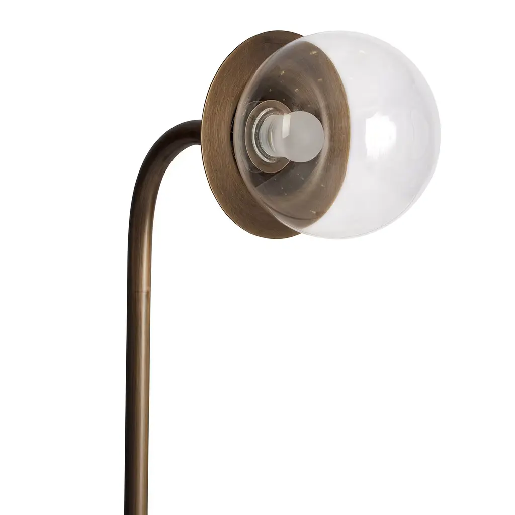 Created for the purpose of brightening any corner of the house, this reading lamp will be the perfect addition to a living room or bedroom reading nook providing directional, diffused, and mood lighting. An exquisite piece of functional decor both when on and off, this versatile design features a slender stem, flat circular base and inverted cone shade of satin brass-finished metal. The globe diffuser is crafted of clear blown glass with a frosted layer inside that, when illuminated, glows with enhanced brightness. Contract and commercial certifications available upon request.