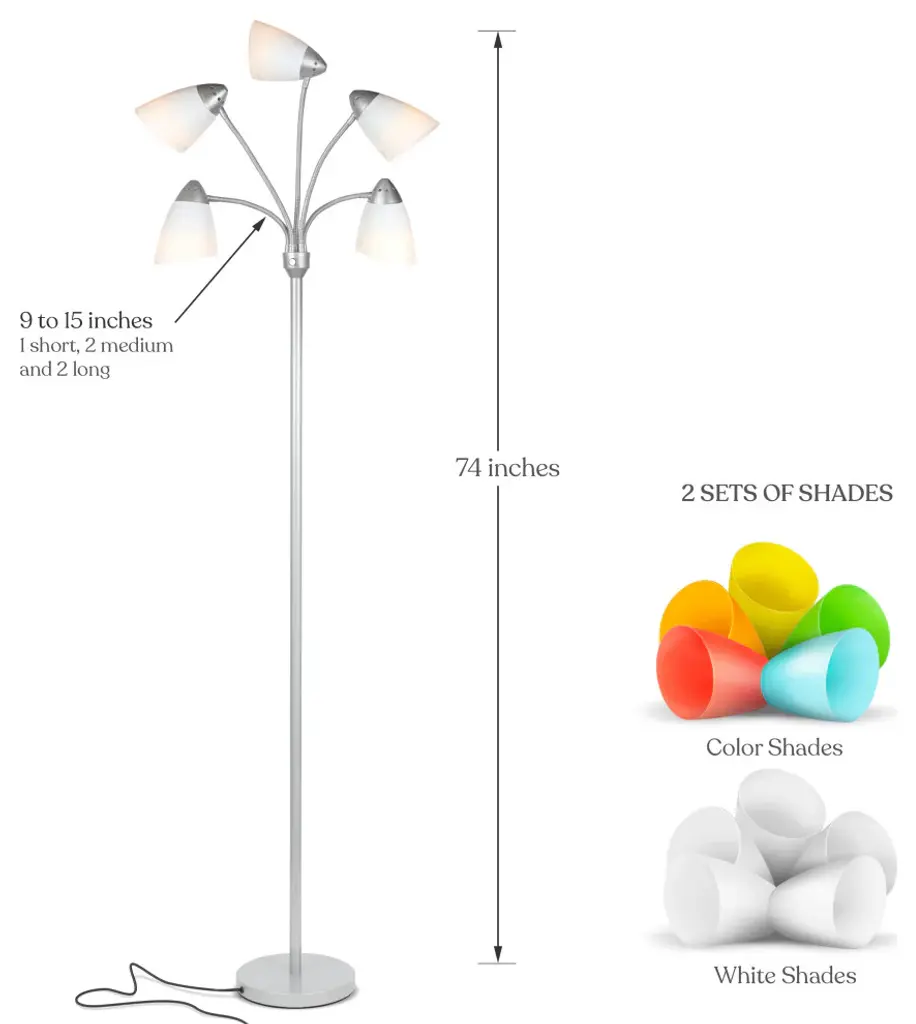 Bright Dimmable LED Lighting: Featuring 5 heads with 800 lumens each, this standing lamp provides 4,000 lumens of high-intensity light. The tall lamp competes with a 300-watt incandescent light while being soft on the eyes. The floor lamp has built-in dimming controls for accent or mood lighting. Turn two heads on, three heads on, or turn all five on. Select a white or multi-color shade set or a variation to match your living room decor. It works as a standing lamp for reading, tasks, or both.Stunning Floor Lamp with Gooseneck Arms: The Brightech Medusa standing lamp is a sure conversation starter for visitors, thanks to its multiple heads and total versatility. Use it in a contemporary, modern, minimalist, or industrial living room, office, or bedroom. Add the floor lamp to a kids'' room with the colored shades to create a unique look the little ones will love. This tall lamp includes bright LED bulbs that can light up the largest rooms while entertaining.Energy-Saving and Long-Lasting Standing Lamp: This Medusa floor lamp includes power-saving LED bulbs rated for 20,000 hours. It offers a 20-year life assuming the tall lamp is used as expected for an average of 3 hours a day. Save 90% on your electricity bill compared to incandescent, CFL, or halogen bulbs and never have the need to replace the bulb. The modern tall lamp has an LED that saves energy by not creating heat. It also prevents injuries by brushing against the lamp bulb.Exceptional Living Room Decor: Position the Brightech Medusa tall lamp in a corner to appreciate its anti-tipping base. Or add the standing lamp base under or behind a sofa and set the arms to illuminate all your reading and crafts. Each head varies in size from 9 to 15 inches to offer the ultimate versatility. The floor lamp has a wide range of motion to be used in both small and large rooms. It can light up work tasks, make reading easier, and everything in between.THE WARRANTY: Unlike other brands, our floor lamps are built to last, and we stand behind that. That''s why Brightech USA offers an industry-leading 3-year warranty covering defects, malfunctions, or sudden failures to your standing lamp when purchased through us. Thanks to our friendly USA-based support team, you''ll rest easy knowing your floor lamp has the backing you can trust.