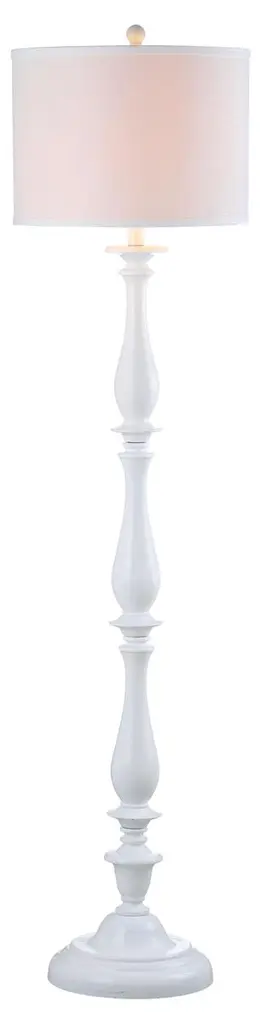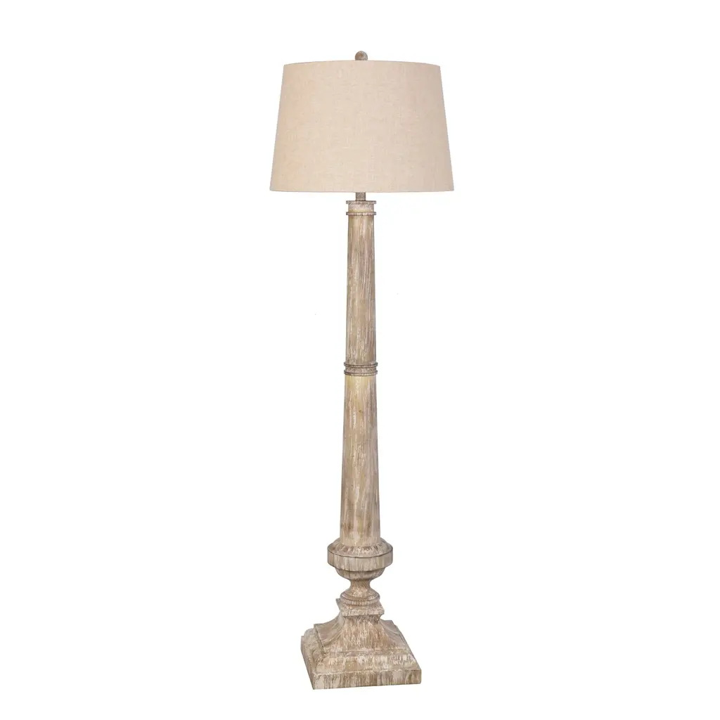 Measures 59-Inch high x 13-Inch diameterHas a 7-foot cord and 3-way switch; Plugs into wall outlet; Standard socket, 1 x 150 watts maximum watts. UL listed for dry locationsTextured vintage white paint finishMakes a Great GiftA slim beautiful wooden floor lamp base that will grace your home with style and elegance.Hand painted and lightly distressed finish. Has 1 E26/Medium (Standard) socket, 150 watts max. Has a 7-foot cord, 8 Inch harp and finial. Solid wood construction. USA made.