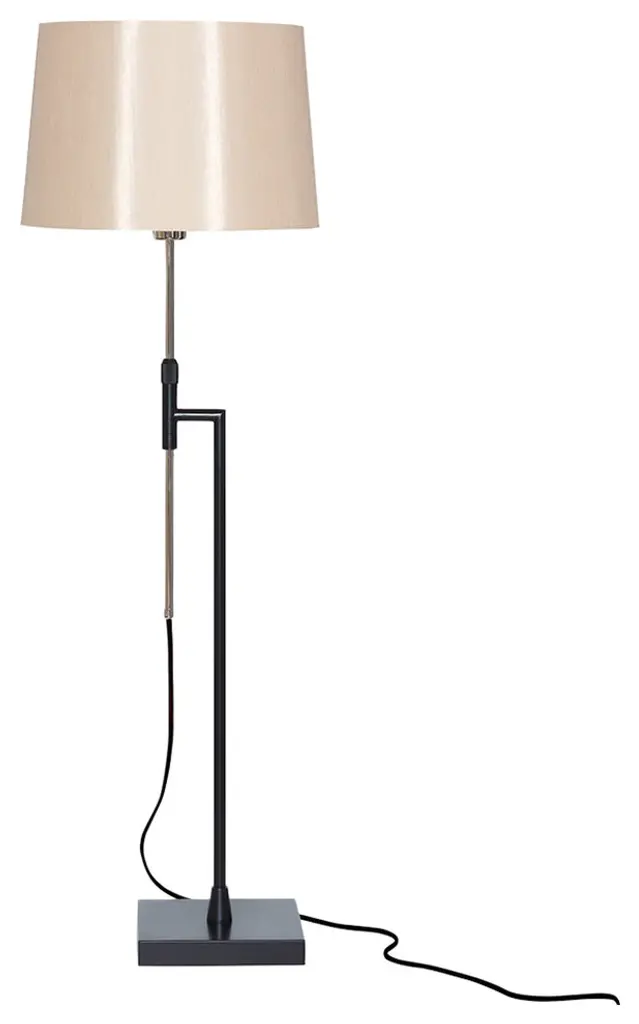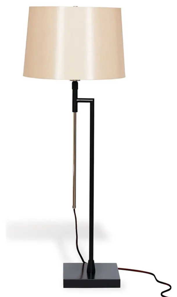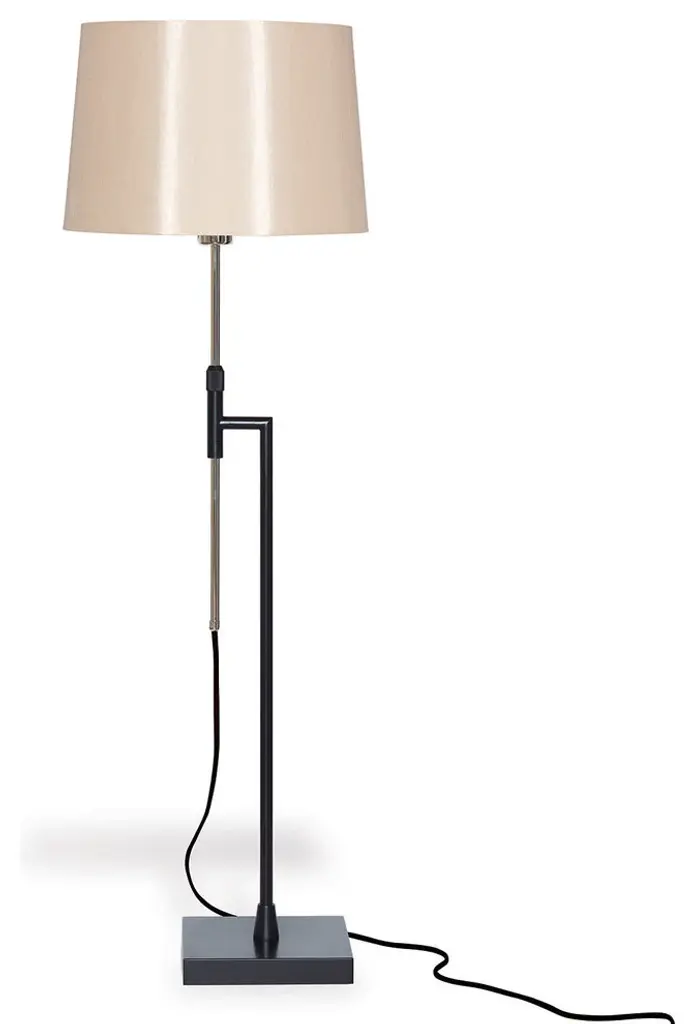 Industrial modern meets flexibility with our Brooklyn lighting. We love the adjustable height options on the table and floor lamps. It is also accented with the English fabric cord in black for that designer touch. Polished nickel accent hardware with semi-gloss black finish. Metal cylinder polished nickel finial.Floor Lamp adjust from 47" height to 63" height. Simply adjust the turning screw at on the arm - and choose the perfect reading height for you!3 way switch. 100 watt max bulb.Shade: Hardback drum shade with soft rolled edge. 15" x 17" x 11"SH. Beige polyester fabric.Materials: steel