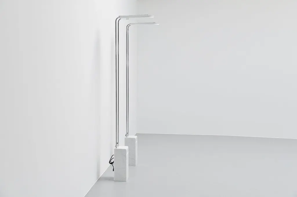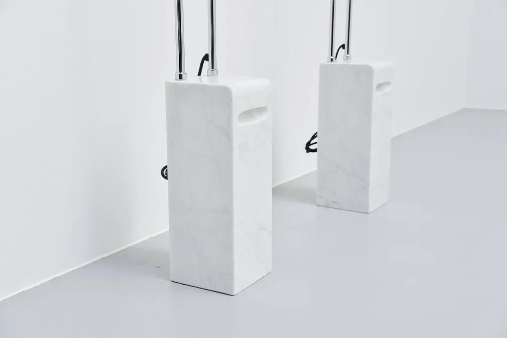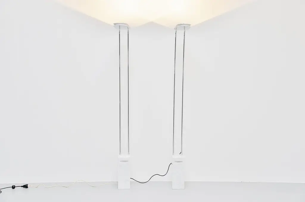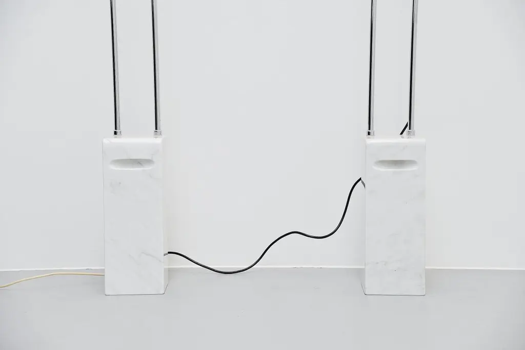 Spectacular pair of 'Gesto' floor lamps designed by Bruno Gecchelin and manufactured by Skipper, Italy, 1975. The lamp has a solid Carrara marble base with very nice grey veins running through. Two chrome-plated tubular frames with a white painted metal shade. Lamp uses a halogen lamp bulb up to 250 watt. Very nice uplighter lamp, super nice in a set of 2. Both lamps are in very good original condition.These lamps are checked, cleaned and are suitable for use in the USA. For US usage you would only have to change the plug or get a holiday converter if needed for a floor or table lamp.