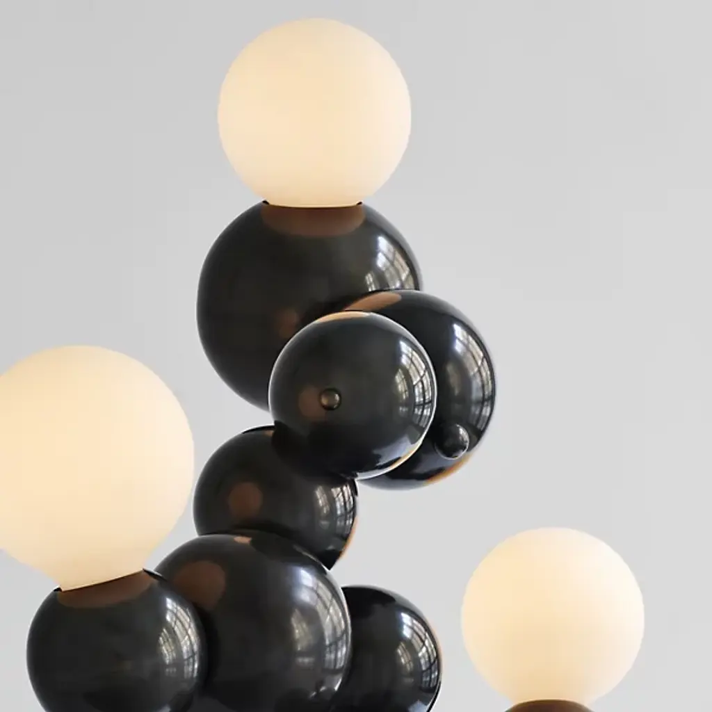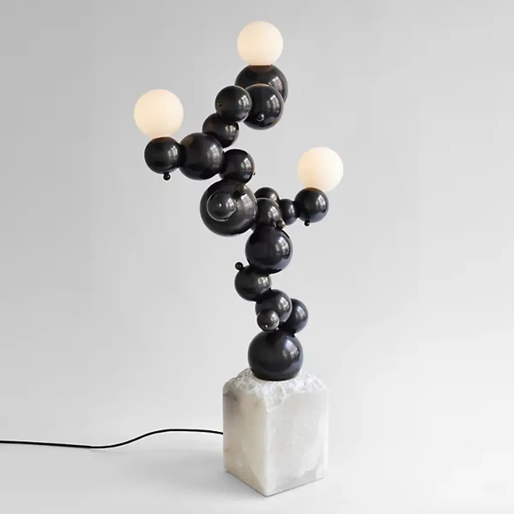 The Bubbly Floor Lamp from Rosie Li Studio is a freestanding functional sculpture, captivating with repeating handcrafted shapes inspired by the grape-like botryoidal hematite mineral and soap bubbles. Forgoing traditional design, creator Rosie Li Studio builds its pieces on science, math, nature, and minimal forms. Nature’s presence is felt instantly with the rich textural notes of the alabaster base. A nod to clustered forms in nature, craftsmen arrange multi-scale brass globes in a tree-like display that visually moves organically. These globes present a fresh silhouette at every viewing angle. Blown glass shades define the warm light. This light creates an atmosphere and adds popping highlights to the tall display.