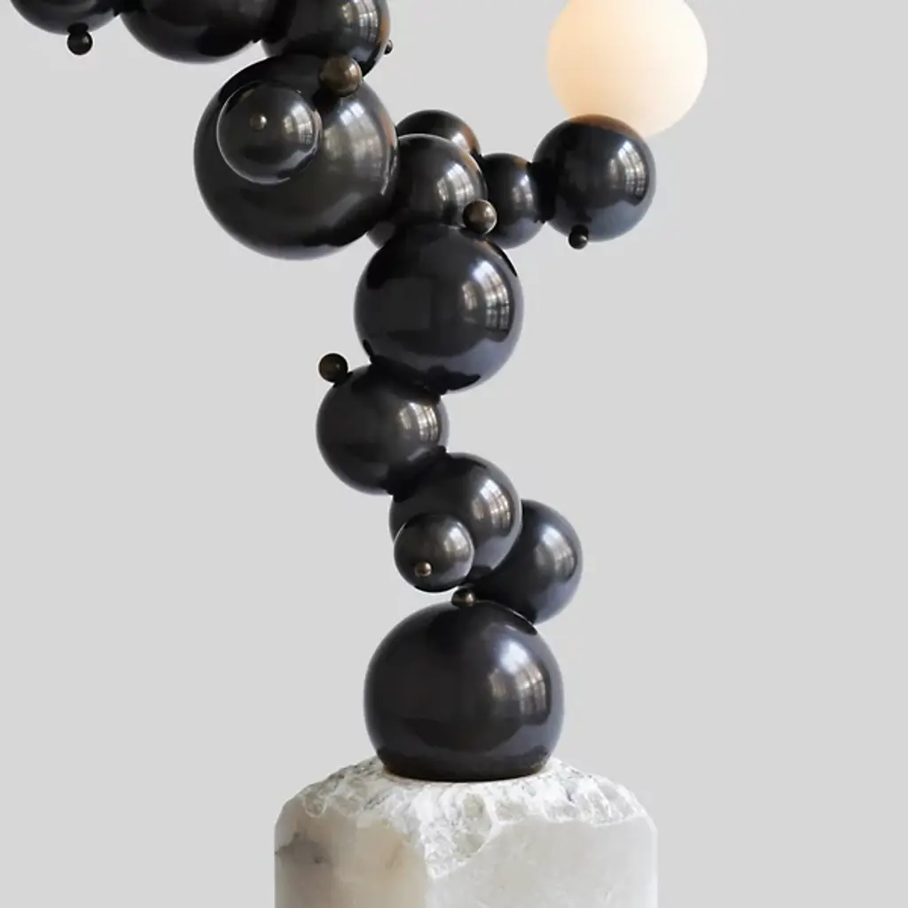 The Bubbly Floor Lamp from Rosie Li Studio is a freestanding functional sculpture, captivating with repeating handcrafted shapes inspired by the grape-like botryoidal hematite mineral and soap bubbles. Forgoing traditional design, creator Rosie Li Studio builds its pieces on science, math, nature, and minimal forms. Nature’s presence is felt instantly with the rich textural notes of the alabaster base. A nod to clustered forms in nature, craftsmen arrange multi-scale brass globes in a tree-like display that visually moves organically. These globes present a fresh silhouette at every viewing angle. Blown glass shades define the warm light. This light creates an atmosphere and adds popping highlights to the tall display.