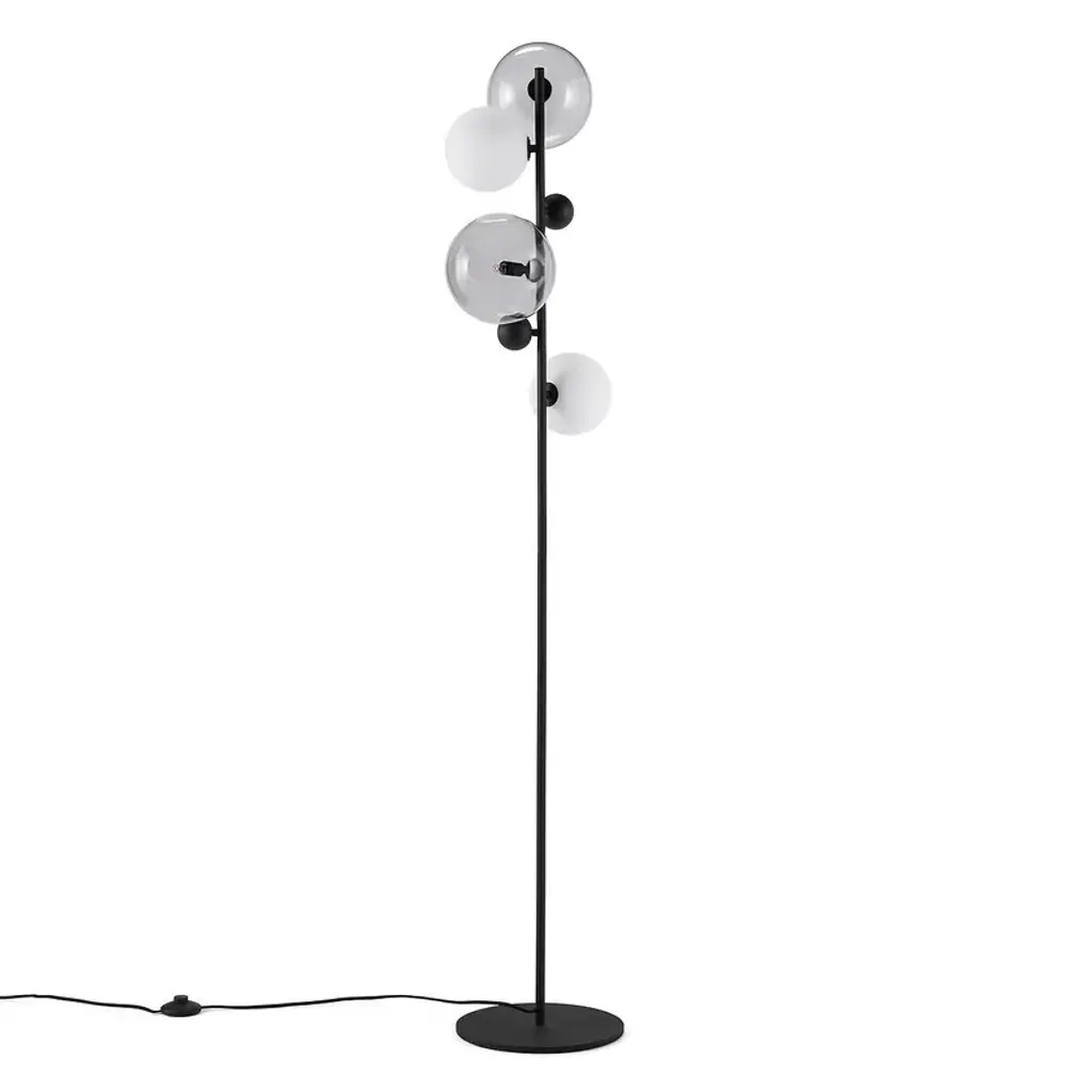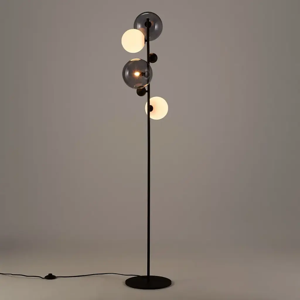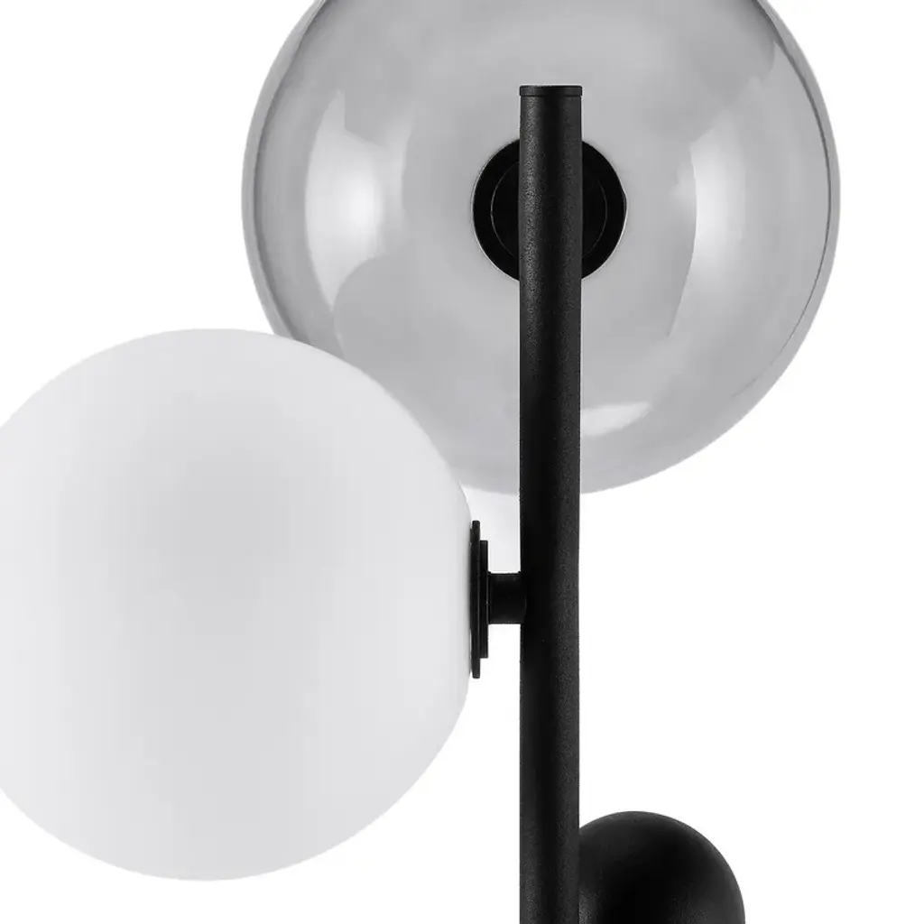 A play of light spheres in balance, poetry and emotion for the Bullesco lamp that makes smoked glass, opaline and metal dance.Glass and steel with gunmetal epoxy finish + 2 globes in smoked blown glass Ø18 cm2 globes in white opaline matte finish Ø14 cm2 steel spheres Ø6 cmFabric enro cable4 GU9 sockets for max 5W bulbs (not included)