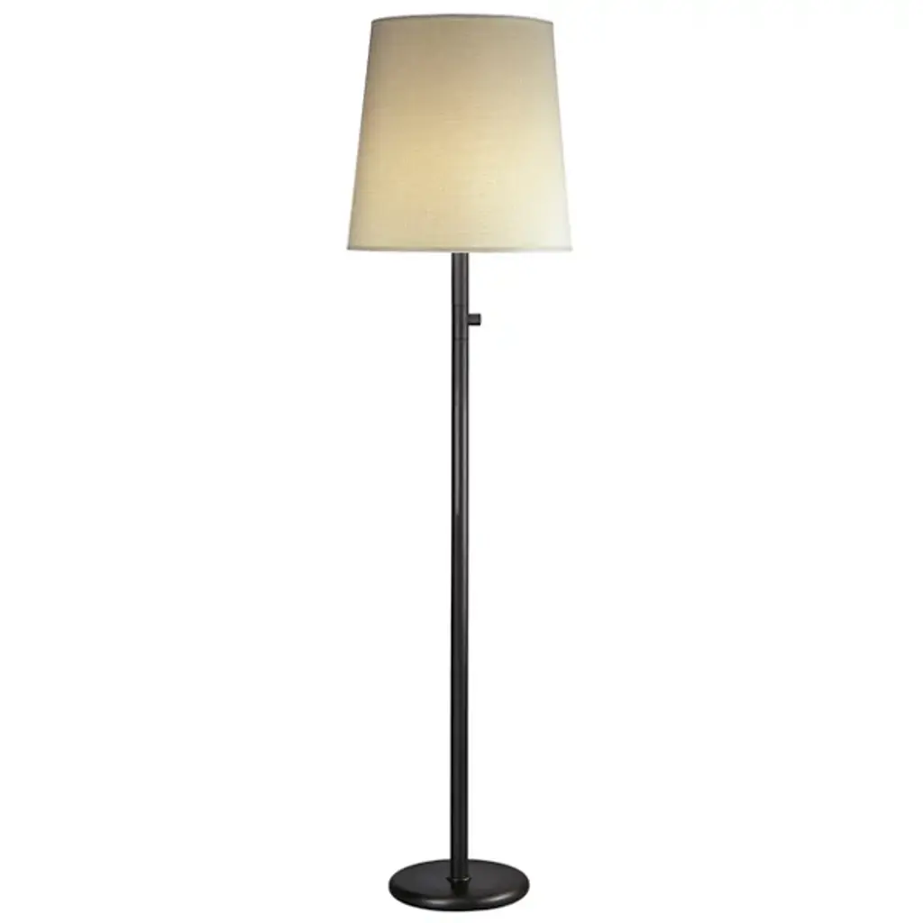 The Rico Espinet Buster Chica Floor Lamp by Robert Abbey offers a classic fabric drum shade for your choice of soft or powerful light diffusion. Able to harness up to 150 watts, the Rico Espinet Buster Chica Floor Lamp may be dimmed or brightened with its full range dimmer to accommodate the user’s preference. Its metal body is a strong contrast to the hardback shade, adding a hint of sophistication to its overall design. Includes a 12 foot cord.