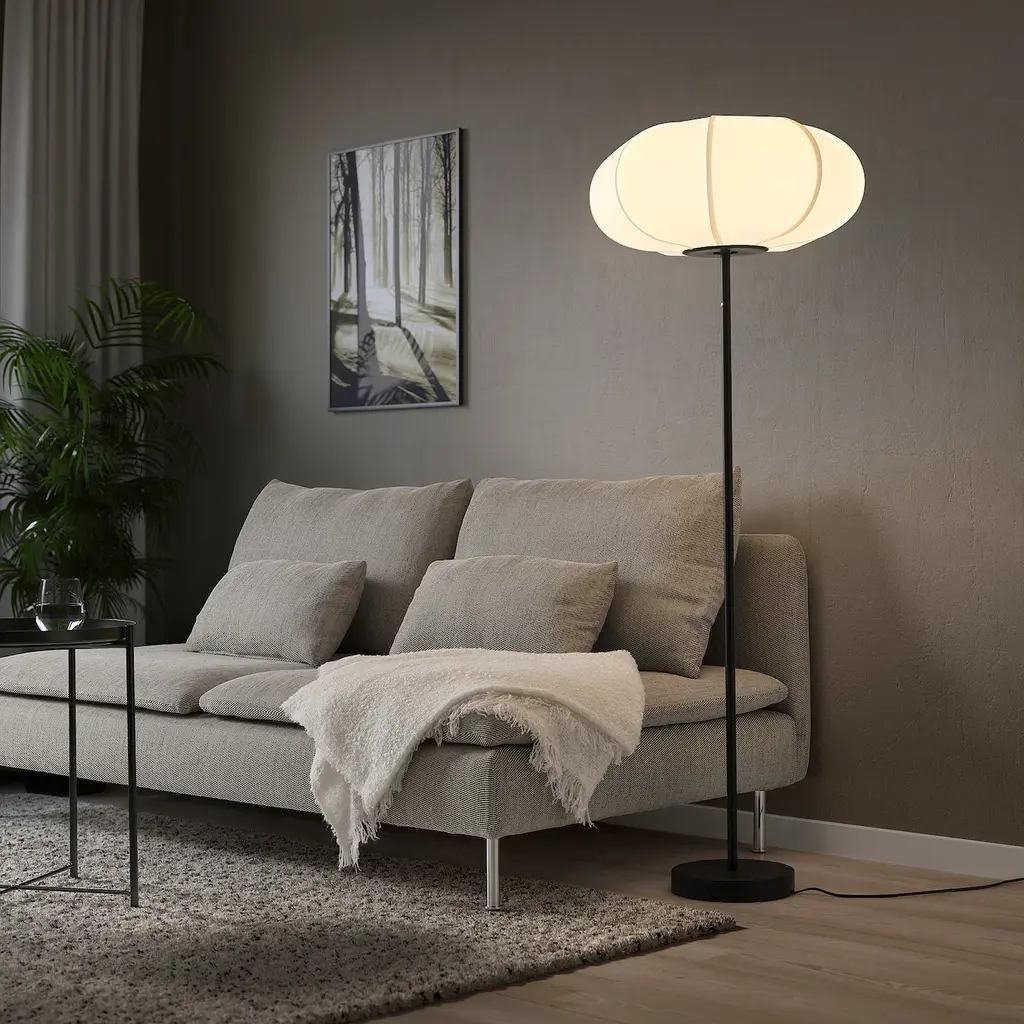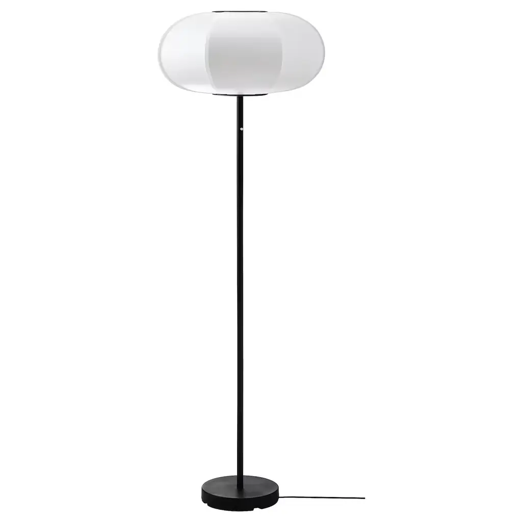 BYGGKORN Floor lamp - black/white. The shade provides a diffused and decorative light. Light bulb sold separately. IKEA recommends LED bulb E26 globe opal white. Special waste handling may be required. Please contact your local authorities for more information.