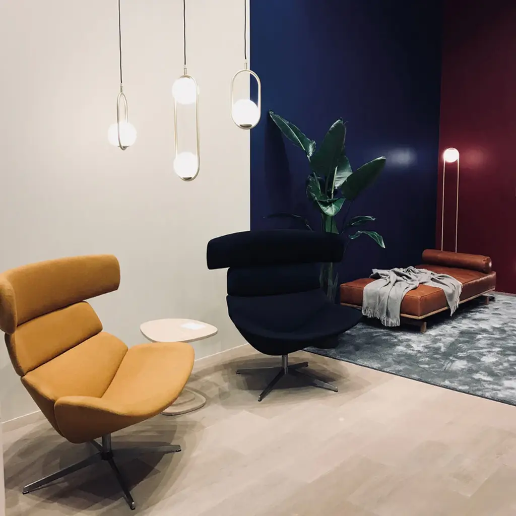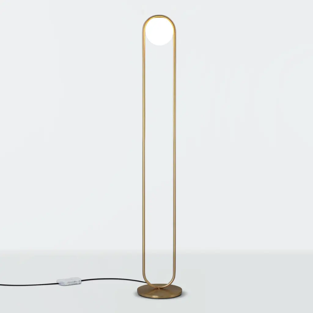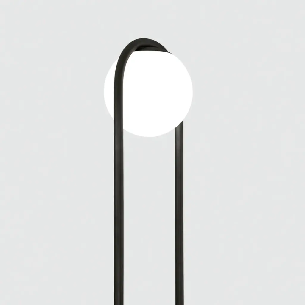 Decorative floor lamp consisting of an opal glass sphere and metal components. Features