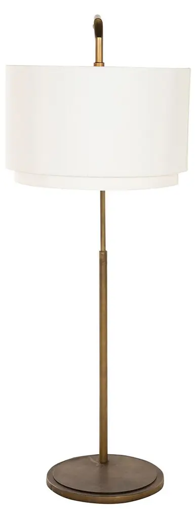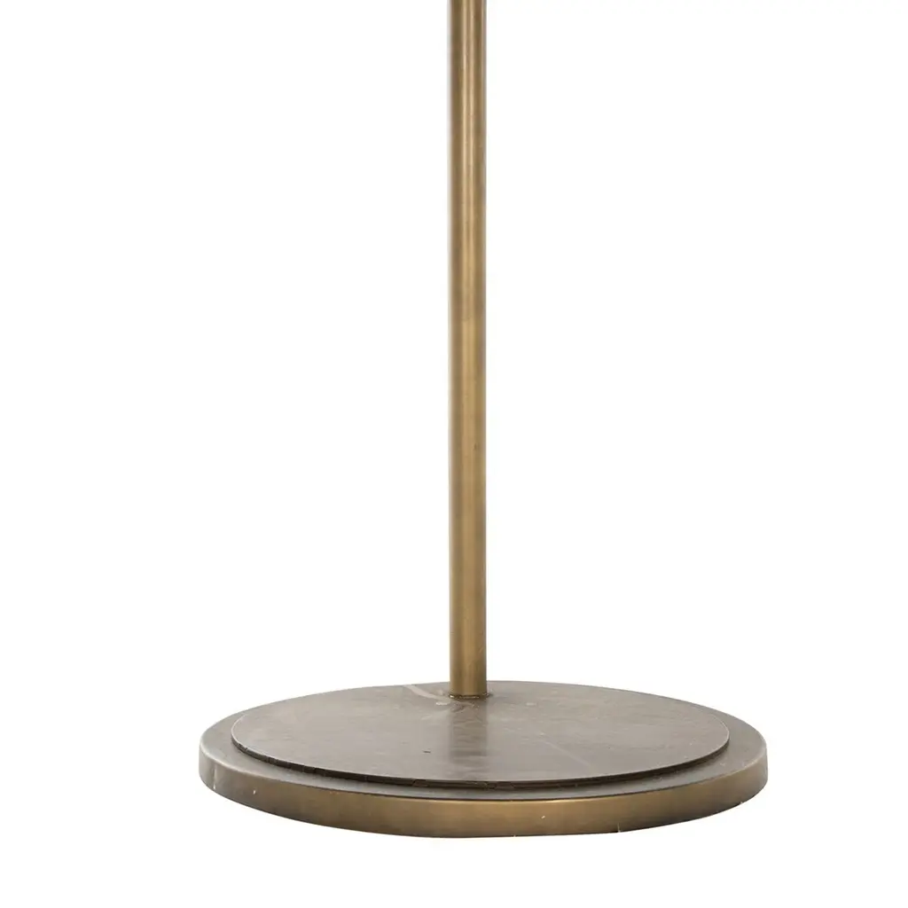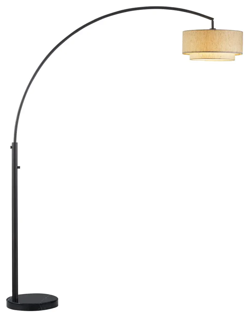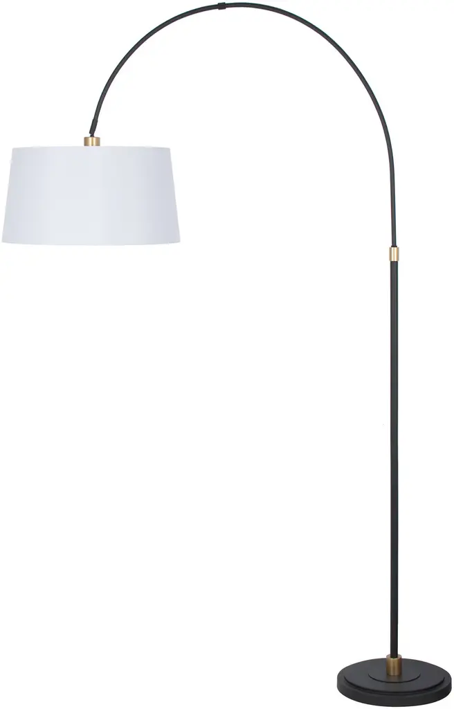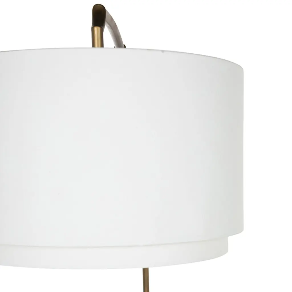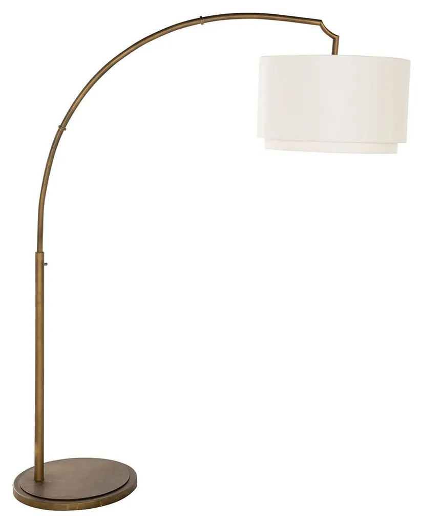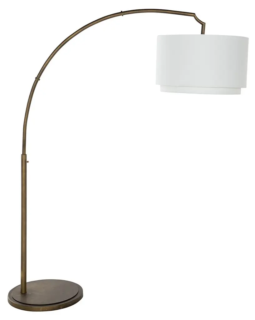 The brushed brass finish brings timeless warmth to the Mid-Century Modern silhouette of this arched floor lamp. The snowy tiered shade echoes the stepped profile of the handcrafted lamp's circular base.