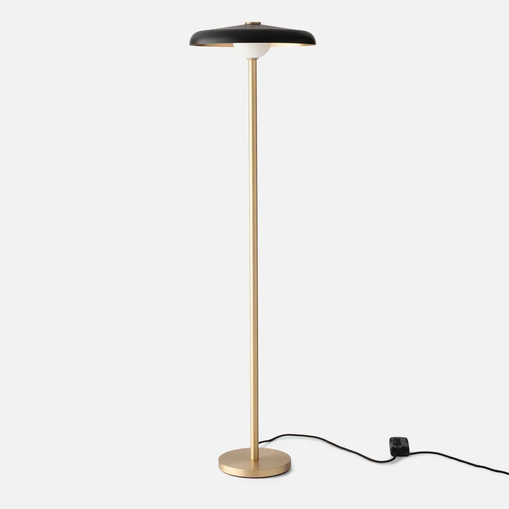 With a pure form and low-profile design, the Caldera Floor Lamp represents utilitarian lighting at its most handsome. Designed by local Portland studio FOLK, it has a metal shade and handblown glass diffuser that softly cast light downward and outward. A solid brass base gives it an extra elegant touch.