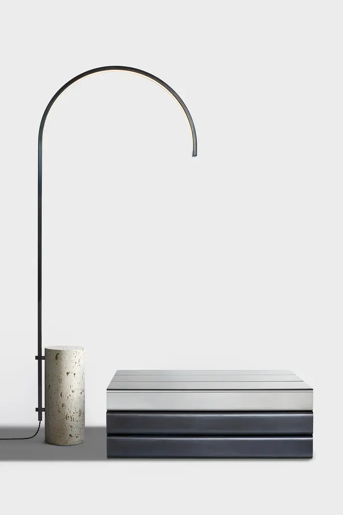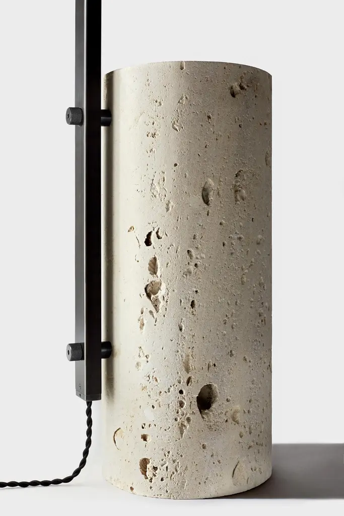 The Cane Floor Lamp is the first freestanding fixture in our expanding lighting collection. Inspired by the geometry of the Chord collection, the Cane has a semi-circular steel armature that emits a warm hue and extends down to the ground. The floating steel stem is counterbalanced both physically and texturally by a rough cordova limestone base. The resultant floor lamp is sculptural, functional and elegant.Handmade in Brooklyn, New York.