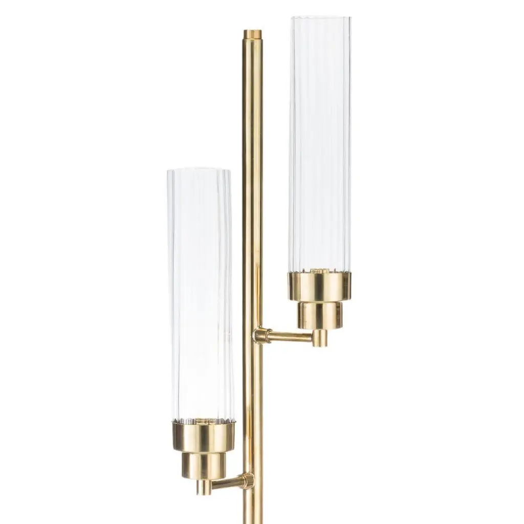 Canneté brass floor lamp with pertains to the Brass Brothers & Co. collection in which classical objects, lamps and furniture have been reinterpreted in more contemporary shape. This floor lamp model is a perfect mix between classic and cmodern, the base and the stem are simple and clean and the double arms support two cylindrical lampholders in ribbed glass.Electrification can be customized according to the buyer's country, please specify during the ordering process.