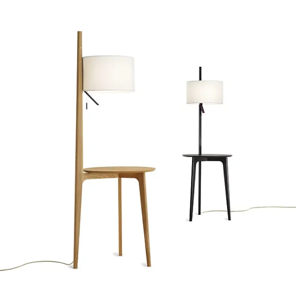 The Carla Floor Lamp from Carpyen showcases style and innovation. It was designed by Gabriel Teixido. This floor lamp goes beyond the conventional, featuring a framework that ingeniously forms a round table, offering a space for displaying books and accessories. Crafted from quality wood, the frame boasts durability and a touch of natural warmth, creating a versatile and functional addition to your living space. Carla blends Spanish and contemporary styles. The shade is illuminated by an LED operated by an on/off fixture switch.