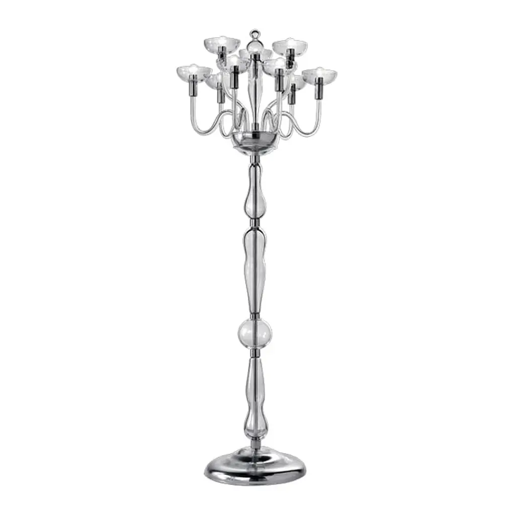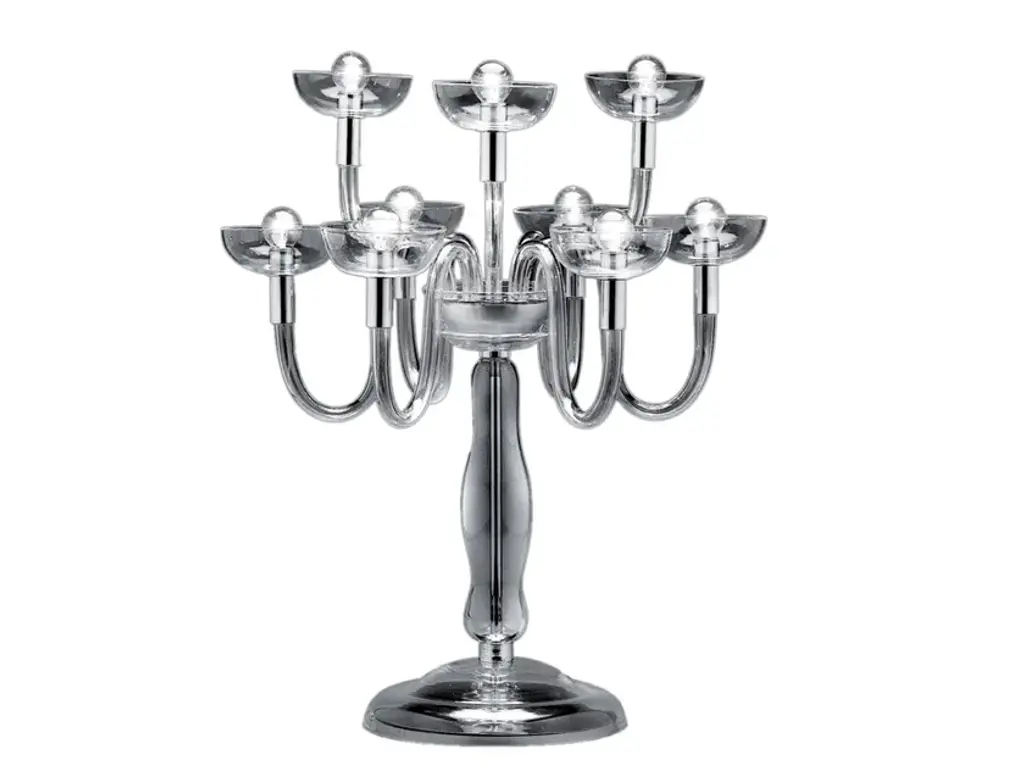 Carlo Scarpa 99.37 is a floor lamp made of hand blown glass with chromed metal structure. An innovative designer with a passion for experimentation, Carlo Scarpa turned this work into the utmost expression of his artistic and artisanal knowledge. The linearity of glass meets hints of flowers, shrubs and unexpected interplays of water. Carlo Scarpa 99.37 is available as a chandelier, a wall light, a table lamp and a floor lamp.Colors:Crystal* Lampshade on requestLight source:9 x max 8W LED E14Numbered Edition
