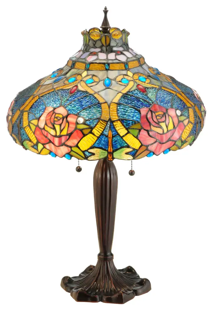 This Tiffany-style Roses floral design 3-light table lamp features an antique bronze finish that will complement many decors throughout your home. Hand crafted from individually hand cut of 740 pieces copper-foiled stained glass and 66 beads that will add color and beauty to any space.(3) 100 Watt max E26 Type A Bulb (not included)Pull chain740pcs glass cut, 66 beadsDownlightIndoor SettingSince these are hand crafted products, the exact color of glass pieces may vary. Colors of the glass will appear darker and less vibrant when not illuminated. Handmade glass will vary from one piece to the other; glass made at different times will also vary. Light bulbs used in lamps or ambient lighting may affect the appearance of the products. Stained glass product has been protected with mineral oil as part of the finishing process. Please use a soft dry cloth to remove any excess oil.