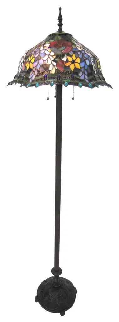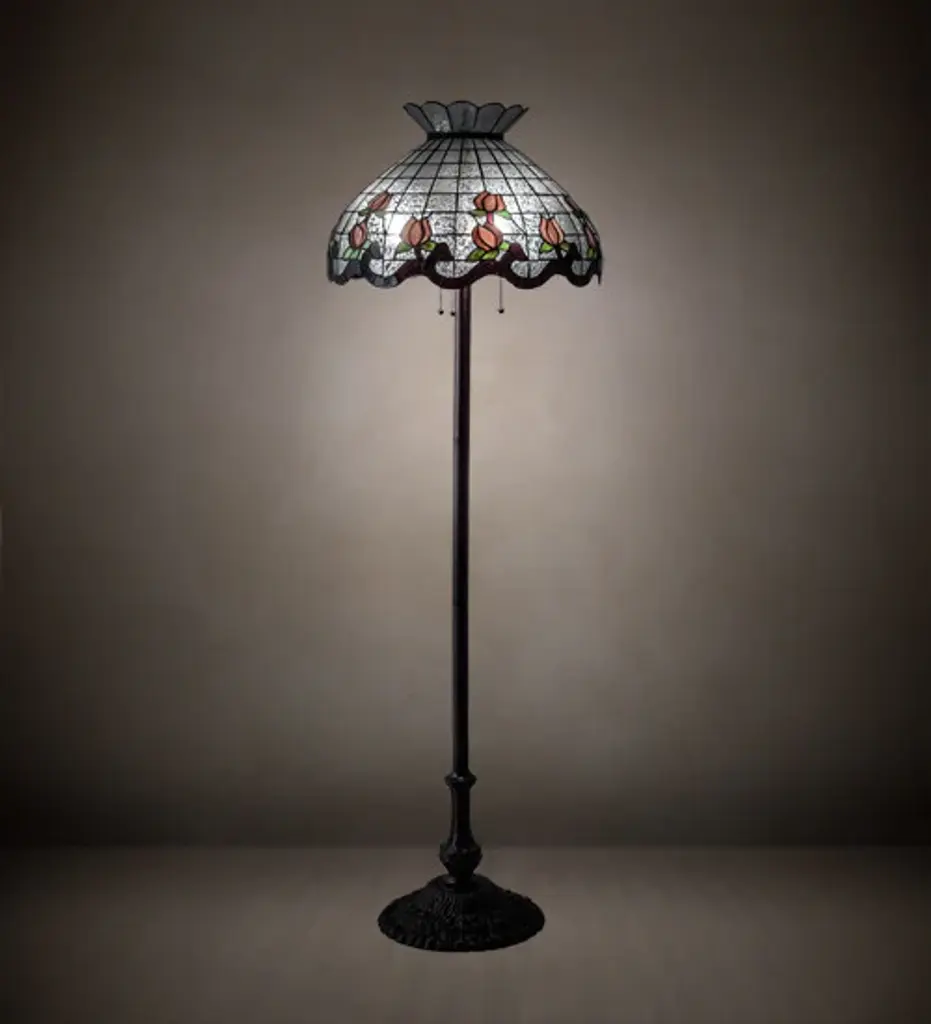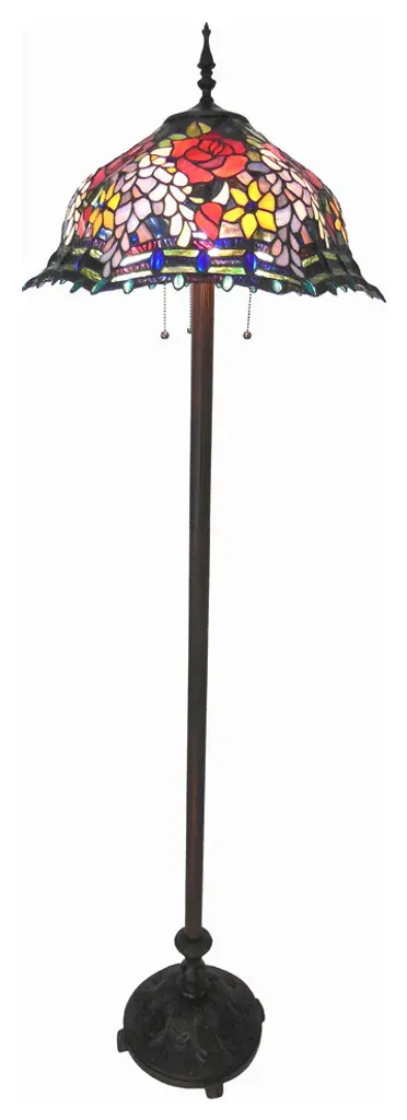 This Tiffany-style Roses floral design 3-light floor lamp features an antique bronze finish that will complement many decors throughout your home. Hand crafted from individually hand cut of 740 pieces copper-foiled stained glass and 66 beads that will add color and beauty to any space.(3) 100 Watt max E26 Type A Bulb (not included)Pull chain740pcs glass cut, 66 beadsDownlightIndoor SettingSince these are hand crafted products, the exact color of glass pieces may vary. Colors of the glass will appear darker and less vibrant when not illuminated. Handmade glass will vary from one piece to the other; glass made at different times will also vary. Light bulbs used in lamps or ambient lighting may affect the appearance of the products. Stained glass product has been protected with mineral oil as part of the finishing process. Please use a soft dry cloth to remove any excess oil.