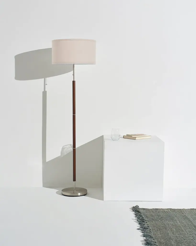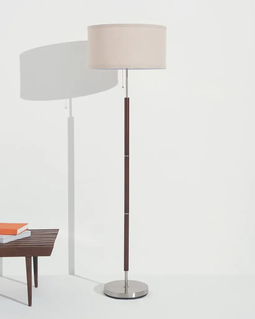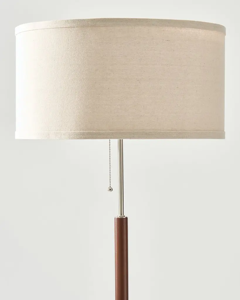The walnut eucalyptus wood finish and neutral linen lamp shade pair perfectly together for this modern floor lamp. It gives off a warm beautiful light with the 800 lumen LED bulb that is included.