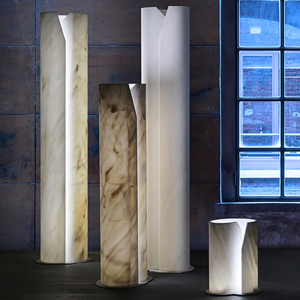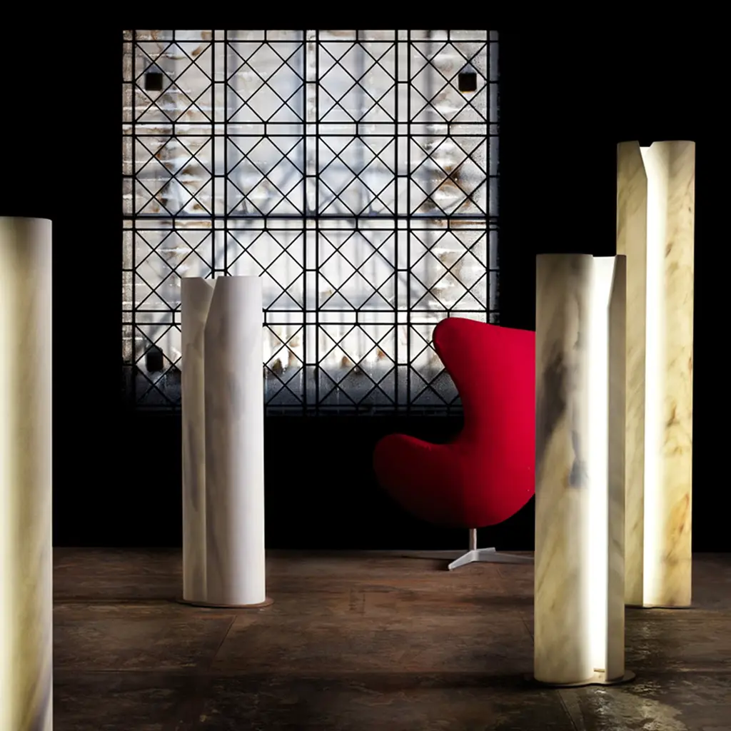 An elegant and sophisticated design by Tobia Scarpa, this gorgeous floor lamp features a striking, singular shape inspired by a thin, folded piece of paper. Sleek and refined, it is handmade from an emptied, single block of White Lasa marble and rests on an anthracite or antiqued marble base to taste and choice, please ask the Concierge for details.