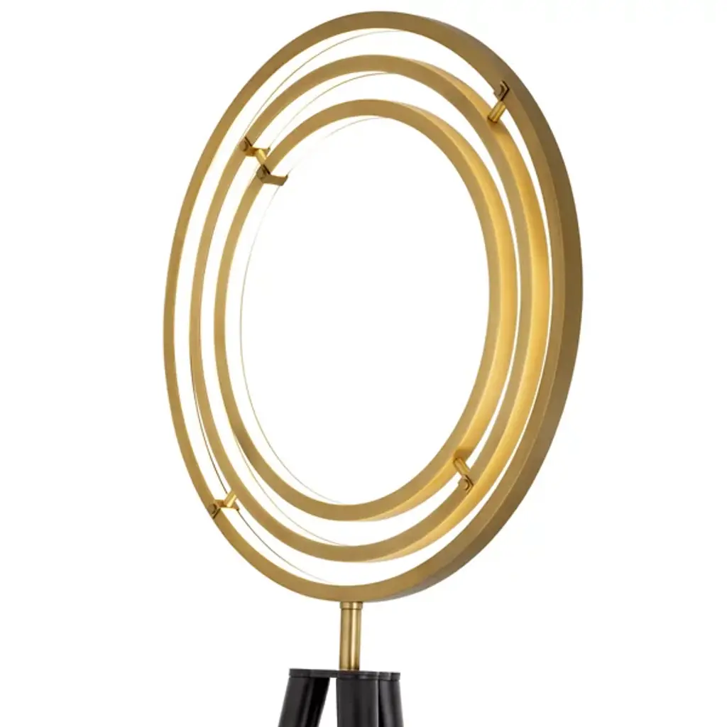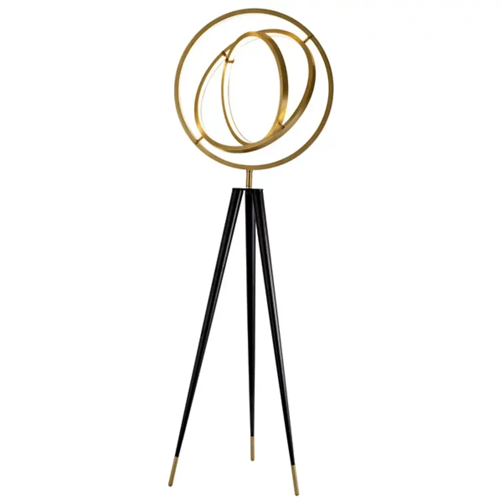 Take a voyage to outer space from indoors with the stunning, open lines of the Cassini LED Floor Lamp from Eichholtz. A contemporary spin on the ancient armillary sphere design, it rises along three matte-textured legs capped with sleek metal tips, using a pivoting central stem to seat three concentric rings, each functioning as housing for energy-friendly LED lamping and able to be repositioned at need. This structure can go from a layered vertical ring to a swooping, three-dimensional sphere in a moment, while translucent diffusers set into each ring blunt excess glare from the lamping with ease.
