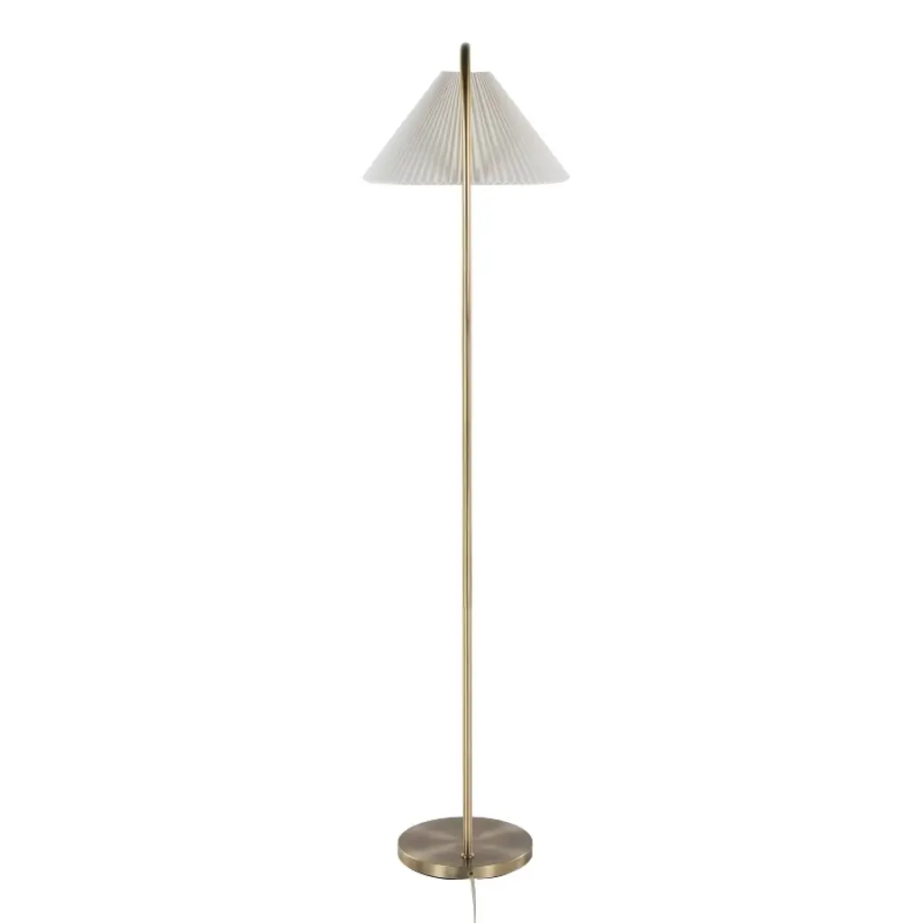 Fall in love with the opulent design of the Cassis Floor Lamp by LumiSource. With a curved gold metal base and a pleated linen empire shade, this unique floor lamp will create an eye-catching aesthetic to amplify the style in any room. Whether placed in your living area, bedroom, or study, this lamp effortlessly enhances any interior, making a bold statement while exuding understated sophistication.Glam / art deco stylingGold metal basePleated white linen empire shade