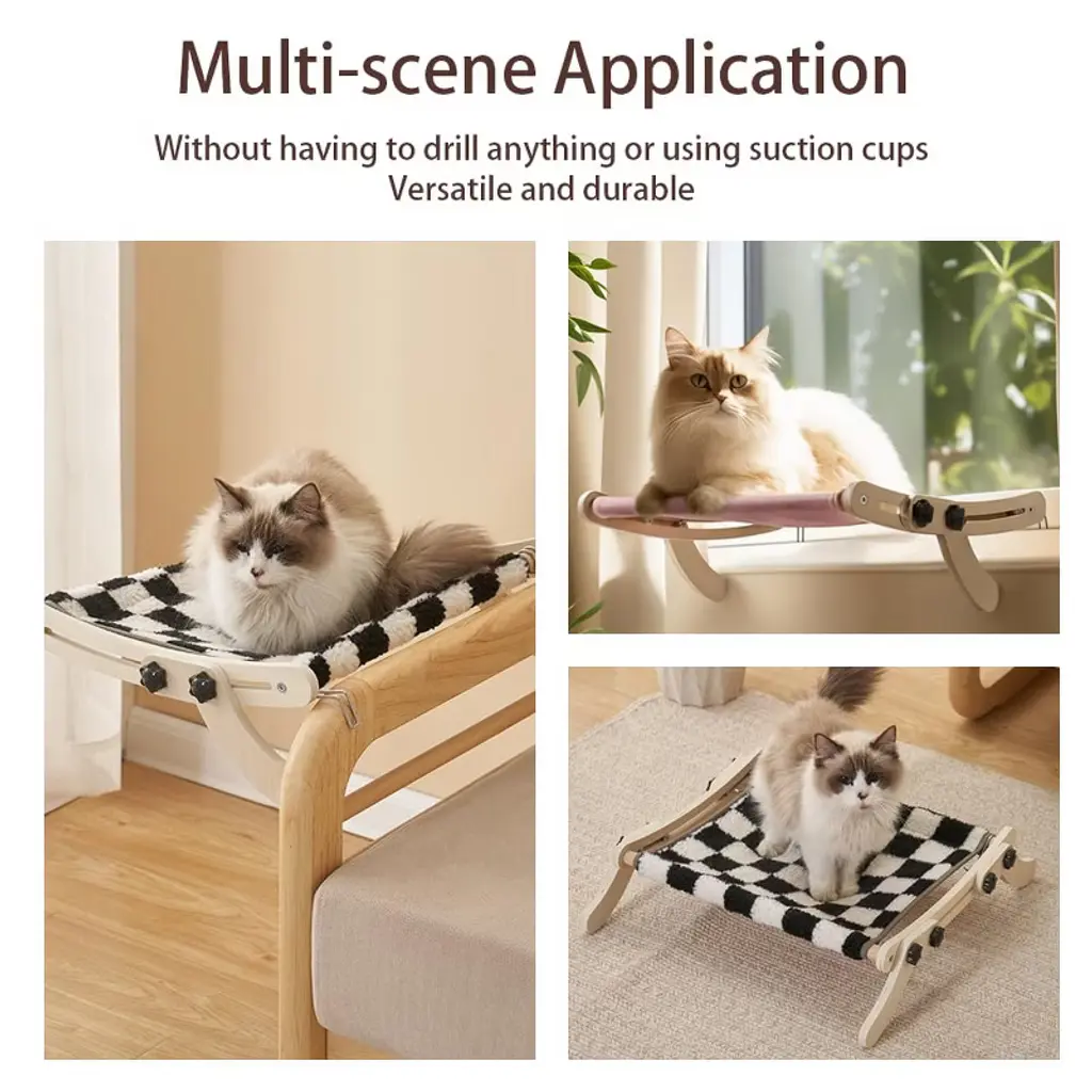 1.Customizable Support SystemFeatures adjustable snap-in legs (telescopic) that adapt to 15"-28" sill widths, reinforced steel hooks, and non-slip grips. Securely holds cats up to 18kg (40 lbs)¡ªideal for large breeds like Maine Coons. The frame locks flush against surfaces without wobbling, ensuring stability on windows, radiators, or furniture edges. 142.Dual-Purpose Lounging DesignFunctions as both a sun-warmed radiator bed (retains heat efficiently) and a bird-watching window perch. Low-profile frame installs bedside, on verandahs, or desks to keep cats near human companions while saving floor space. The canvas surface encourages nesting for naps or play. 183.Furniture-Safe, Space-Saving SecurityUses clamp-on grips (not suction cups) that attach securely to sills, headboards, or cabinets without leaving marks. Compact frame extends only 12" from surfaces, ideal for apartments. Tested to prevent tipping even during energetic jumps. 144.Scratch & Fur-Resistant Easy CleaningRemovable cover made of tight-weave canvas sheds fur effortlessly and resists claw damage. Machine-washable (cold cycle) and quick-drying fabric maintains hygiene between uses. Wipe-down metal frame prevents rust or odor buildup. 155.Multi-Location FlexibilityInstalls in 5+ spots: sunny windows (UV-resistant fabric), radiators, bookshelves, dressers, or verandahs. Contains shed fur in designated zones and adapts to cats¡¯ preference shifts. Includes rubber-tipped legs for floor use as a freestanding bed. 19