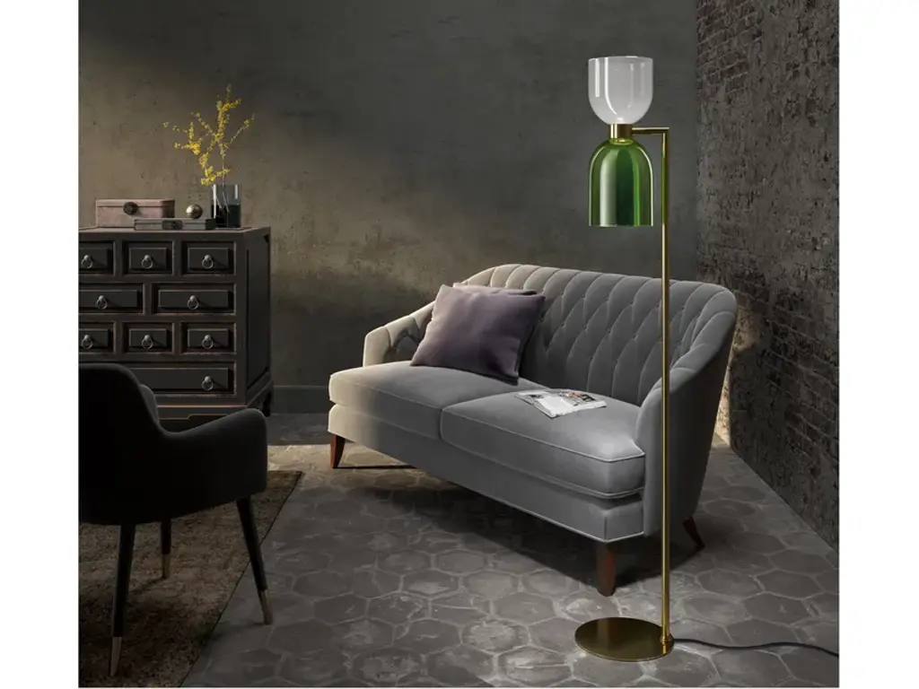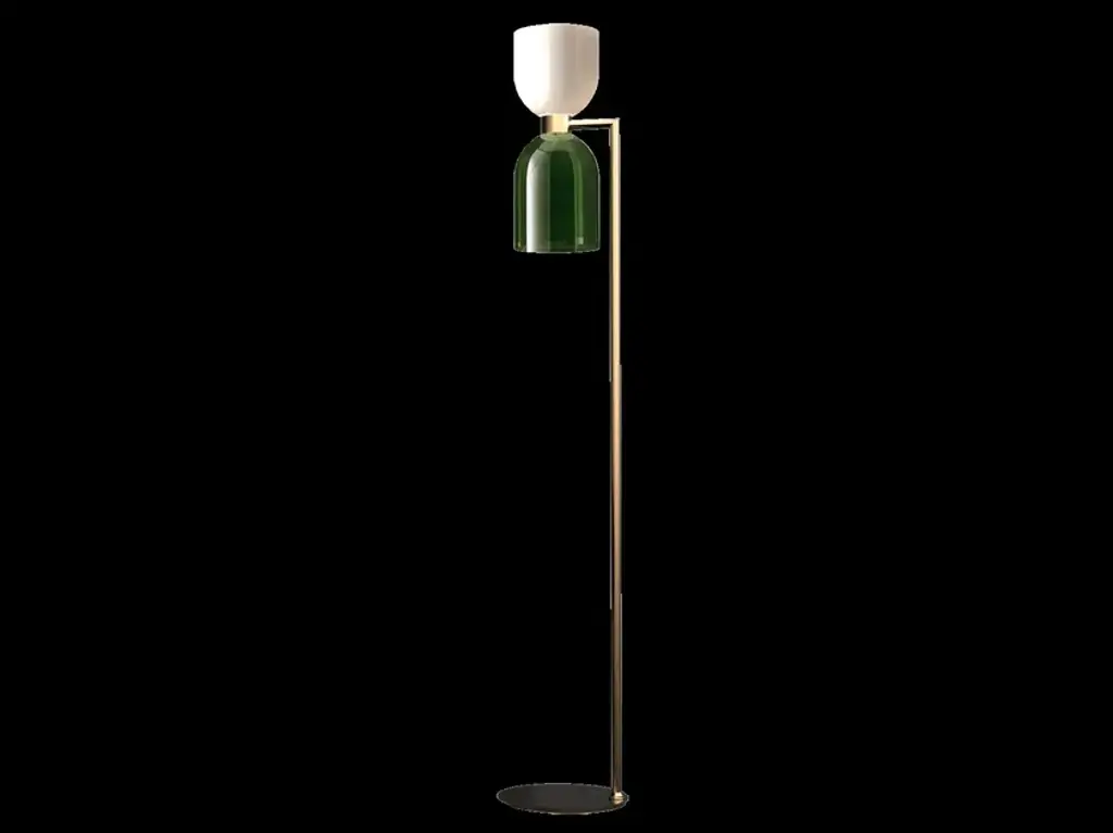 Caterina is a floor lamp, with direct and indirect light, and is part of homonymous collection designed by THDP and Simone Bretti for Italamp.Electrical and technical characteristicsLED: 6,4 wLumen: 740Temperature: 3000 KCRI>80Driver: TRIAC (included and dimmable)Voltage: 230 VEnergy class: A+IP20Certifications: CE/EAC/ULCaterina collection is a double emission wall, table and floor lamp, made by the THDP studio and Simone Bretti, dimmable, made of brushed brass and green borosilicate glass oven baked and opal glass.It offers versatile solutions, able to fully satisfy both needs of commercial and hospitality spaces and to find a perfect location in residential environments thanks to the double light emission.