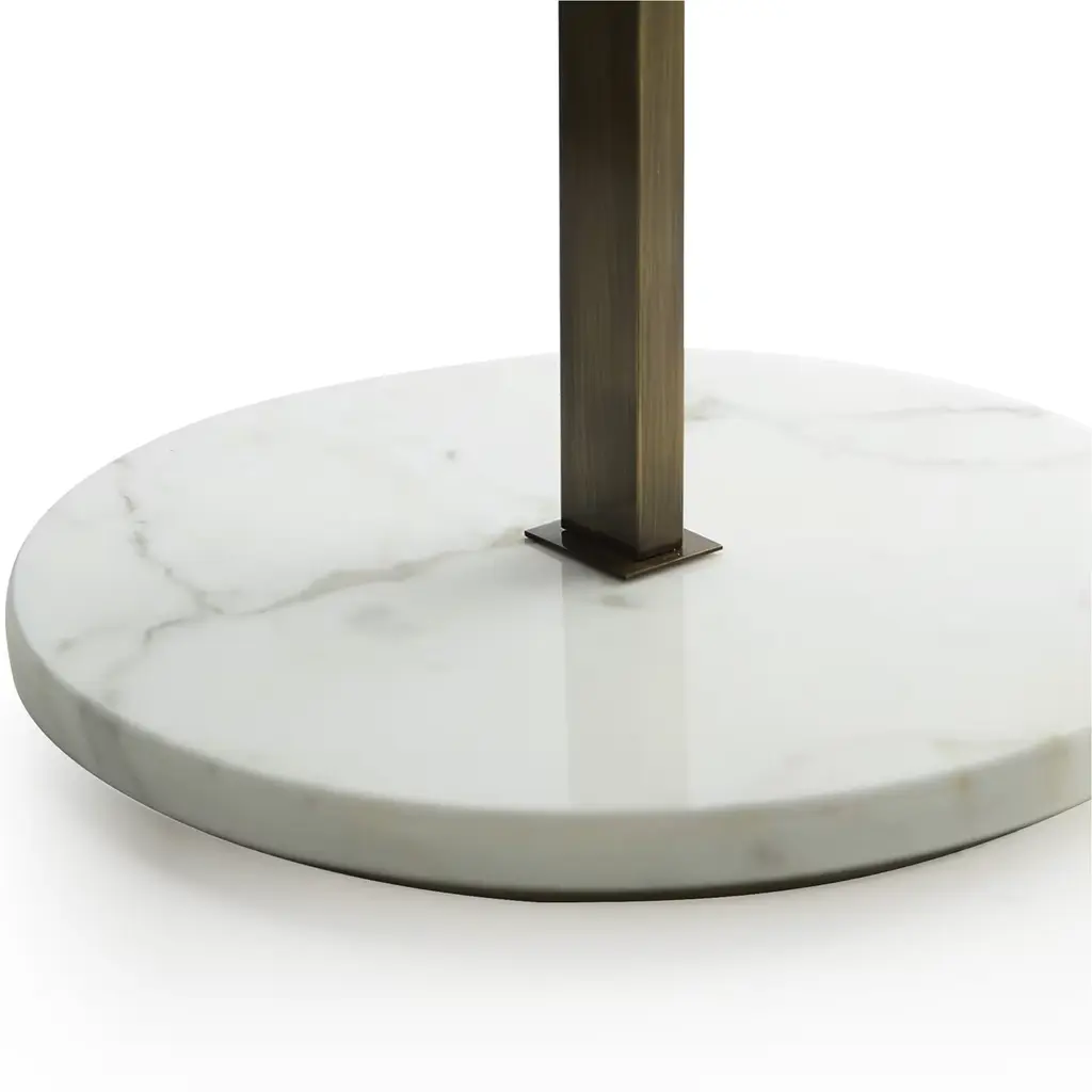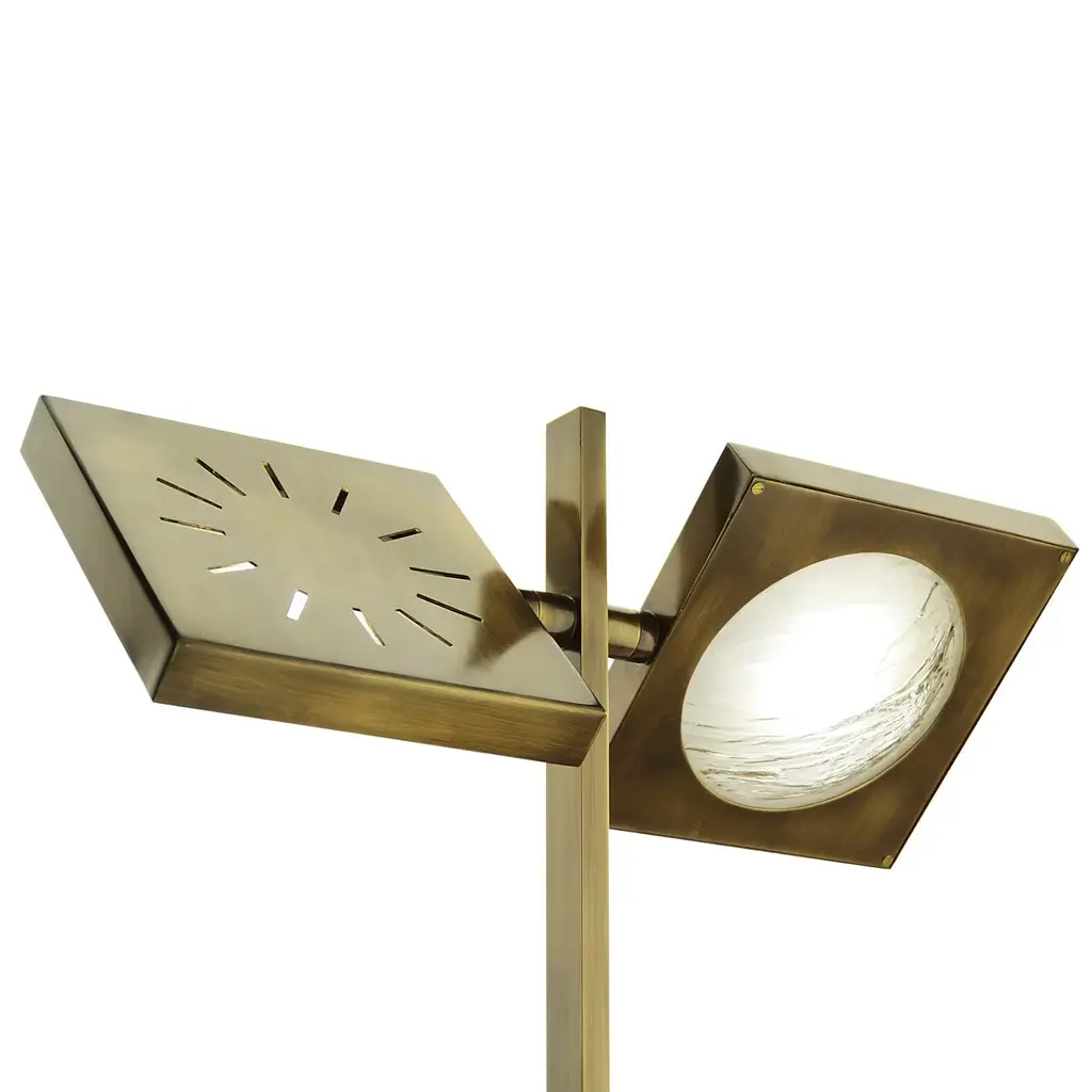 This exquisite floor lamp, designed by Studio 63 for Marioni, features a base in marble and a brass pole supporting two square double lens in polycarbonate with an ice finish.