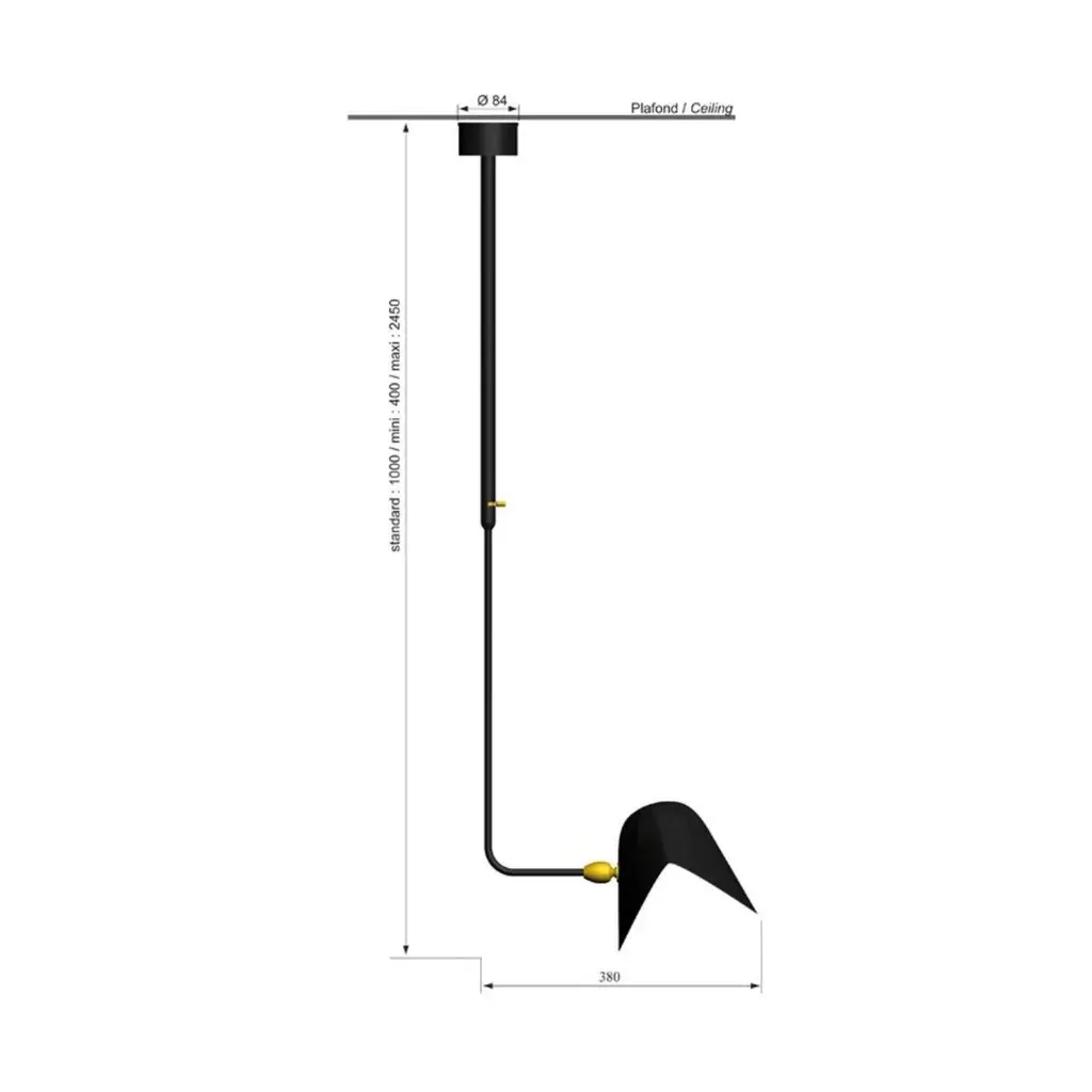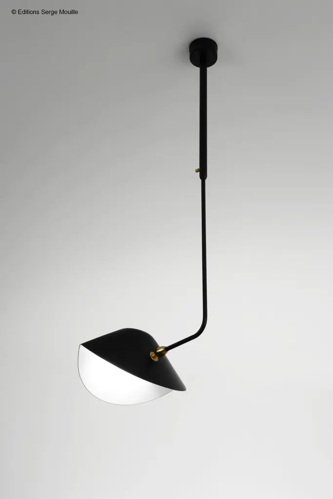 Ceiling lamp bookshelf curved by Serge MouilleDimensions: D38 x H100 cm.Materials: brass, steel, aluminumOne of a King. Numbered.Also available in different color. All our lamps can be wired according to each country. If sold to the USA it will be wired for the USA for instance.Available in standard height or made-to-measure on request, the Bibliothèque Courbe Serge Mouille ceiling light is a 1958 reissue made in France by Éditions Serge Mouille. It consists of a curved black steel rod and a mobile aluminum reflector with a glossy white interior fixed on a brass ball joint. We assure you a fast delivery for this numbered model with certificate of authenticity. Also available in white.Serge MouilleBorn in Paris in 1922, Serge Mouille is today considered one of the greatest lighting designers in the world. He developed a talent for drawing and creation very early on and was the youngest student of his time to be admitted to the School of Applied Arts at the age of 13.Master goldsmith, Serge Mouille learned the art of modeling metal with a hammer thanks to his mentor Gabriel Lacroix and worked for several goldsmith houses in Paris. It was his meeting with Jacques Adnet, director of the Compagnie des arts français, that would mark a turning point in his career.In 1951, Jacques Adnet commissioned Serge Mouille to create a “large light fixture” for his South American customers: the first three-arm floor lamp was born. This innovative luminaire in molded black steel with organic shapes will influence his famous series of "Black Forms" and will forever mark the history of design. Serge Mouille then passes from the status of master craftsman to that of creative artist.At the beginning of the 1960s, Serge Mouille decided to radically distance himself from everything he had created until then by developing a series of light columns with fluorescent tubes. In 1963, he stopped producing lights to devote himself to teaching.Suffering from tuberculosis, Serge Mouille died in 1988 and his widow, Gin Mouille, decided to continue to bring his art to life by publishing under license his most emblematic creations. Each copy is made in France by Éditions Serge Mouille and has an engraved serial number, accompanied by a certificate of authenticity.