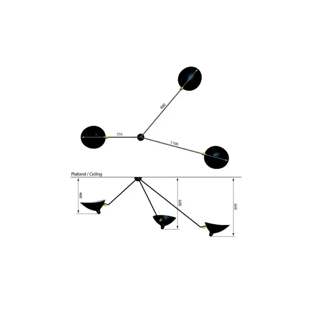 Ceiling lamp Spider 3 still arms by Serge MouilleDimensions: D165 x W90 x H65 cmMaterials: Brass, steel, aluminiumOne of a King. Numbered.Also available in different colour.All our lamps can be wired according to each country. If sold to the USA it will be wired for the USA for instance.The Serge Mouille Spider ceiling lamp with 3 fixed arms is a faithful reissue of an emblematic model from 1954. Made in France by Éditions Serge Mouille, it consists of 3 fixed arms in black steel, each finished with an adjustable aluminum reflector with a white interior bright. We assure you a fast delivery for this numbered model with certificate of authenticity. Also available in white.Serge MouilleBorn in Paris in 1922, Serge Mouille is today considered one of the greatest lighting designers in the world. He developed a talent for drawing and creation very early on and was the youngest student of his time to be admitted to the School of Applied Arts at the age of 13.Master goldsmith, Serge Mouille learned the art of modeling metal with a hammer thanks to his mentor Gabriel Lacroix and worked for several goldsmith houses in Paris. It was his meeting with Jacques Adnet, director of the Compagnie des arts français, that would mark a turning point in his career.In 1951, Jacques Adnet commissioned Serge Mouille to create a “large light fixture” for his South American customers: the first three-arm floor lamp was born. This innovative Luminaire in molded black steel with organic shapes will influence his famous series of "Black Forms" and will forever mark the history of design. Serge Mouille then passes from the status of master craftsman to that of creative artist.At the beginning of the 1960s, Serge Mouille decided to radically distance himself from everything he had created until then by developing a series of light columns with fluorescent tubes. In 1963, he stopped producing lights to devote himself to teaching.Suffering from tuberculosis, Serge Mouille died in 1988 and his widow, Gin Mouille, decided to continue to bring his art to life by publishing under license his most emblematic creations. Each copy is made in France by Éditions Serge Mouille and has an engraved serial number, accompanied by a certificate of authenticity.