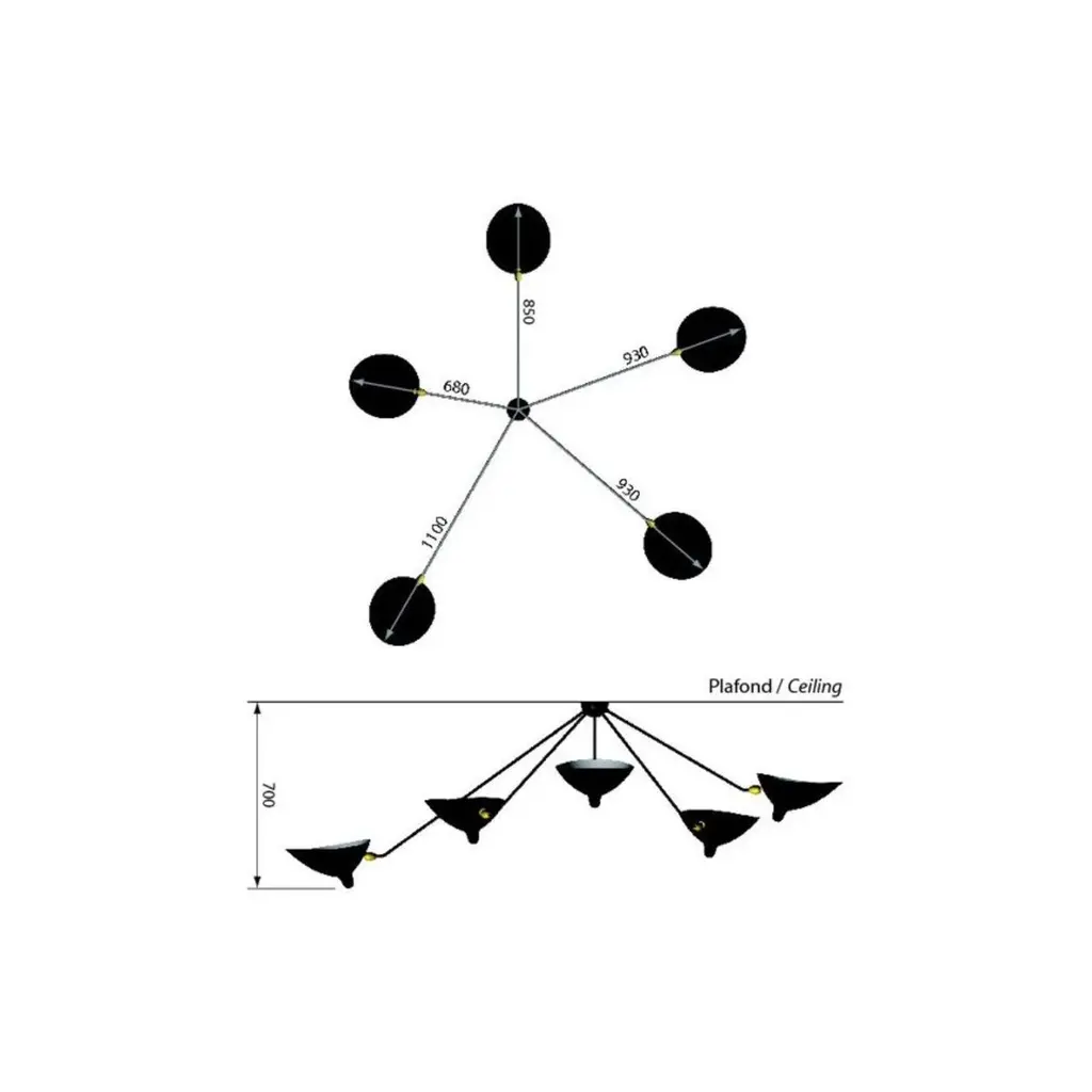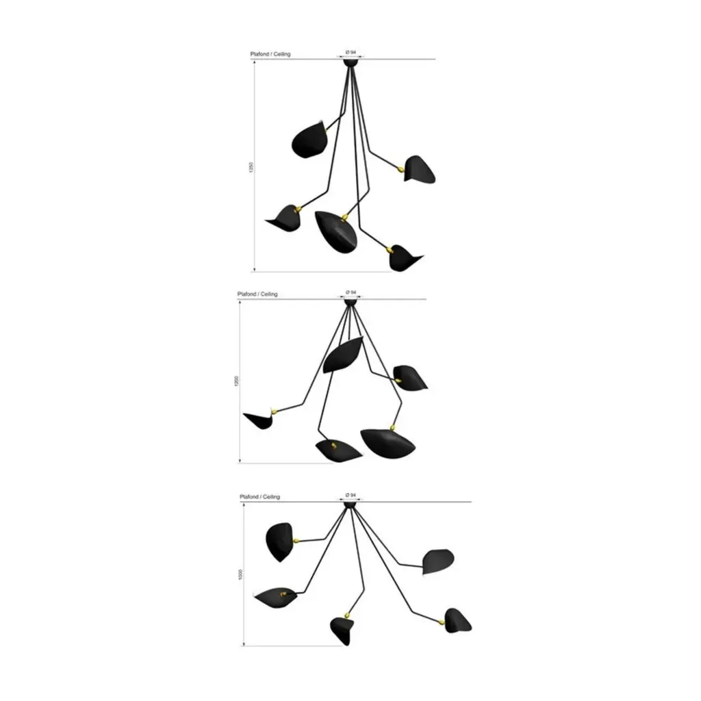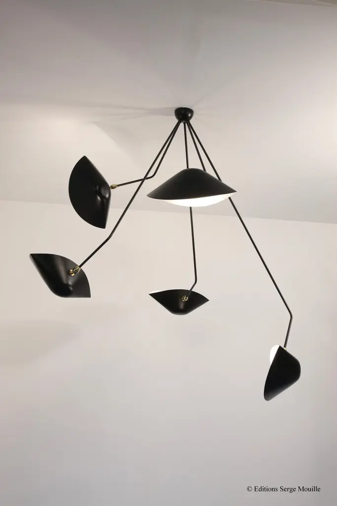 Ceiling lamp spider 5 still arms by Serge MouilleDimensions: D195 x H70 cmMaterials: Brass, Steel, AluminumOne of a King. Numbered.Also available in different color. All our lamps can be wired according to each country. If sold to the USA it will be wired for the USA for instance.Designed with 5 steel rods of different lengths, this Serge Mouille Spider ceiling light with 5 fixed arms is a faithful reissue of a 1954 light. Made in France by Éditions Serge Mouille, it has 5 aluminum reflectors with a glossy white interior, adjustable thanks to a brass ball joint. Delivered as soon as possible, it is numbered and accompanied by its certificate of authenticity. Also available in white.Serge MouilleBorn in Paris in 1922, Serge Mouille is today considered one of the greatest lighting designers in the world. He developed a talent for drawing and creation very early on and was the youngest student of his time to be admitted to the School of Applied Arts at the age of 13.Master goldsmith, Serge Mouille learned the art of modeling metal with a hammer thanks to his mentor Gabriel Lacroix and worked for several goldsmith houses in Paris. It was his meeting with Jacques Adnet, director of the Compagnie des arts français, that would mark a turning point in his career.In 1951, Jacques Adnet commissioned Serge Mouille to create a “large light fixture” for his South American customers: the first three-arm floor lamp was born. This innovative luminaire in molded black steel with organic shapes will influence his famous series of "Black Forms" and will forever mark the history of design. Serge Mouille then passes from the status of master craftsman to that of creative artist.At the beginning of the 1960s, Serge Mouille decided to radically distance himself from everything he had created until then by developing a series of light columns with fluorescent tubes. In 1963, he stopped producing lights to devote himself to teaching.Suffering from tuberculosis, Serge Mouille died in 1988 and his widow, Gin Mouille, decided to continue to bring his art to life by publishing under license his most emblematic creations. Each copy is made in France by Éditions Serge Mouille and has an engraved serial number, accompanied by a certificate of authenticity.