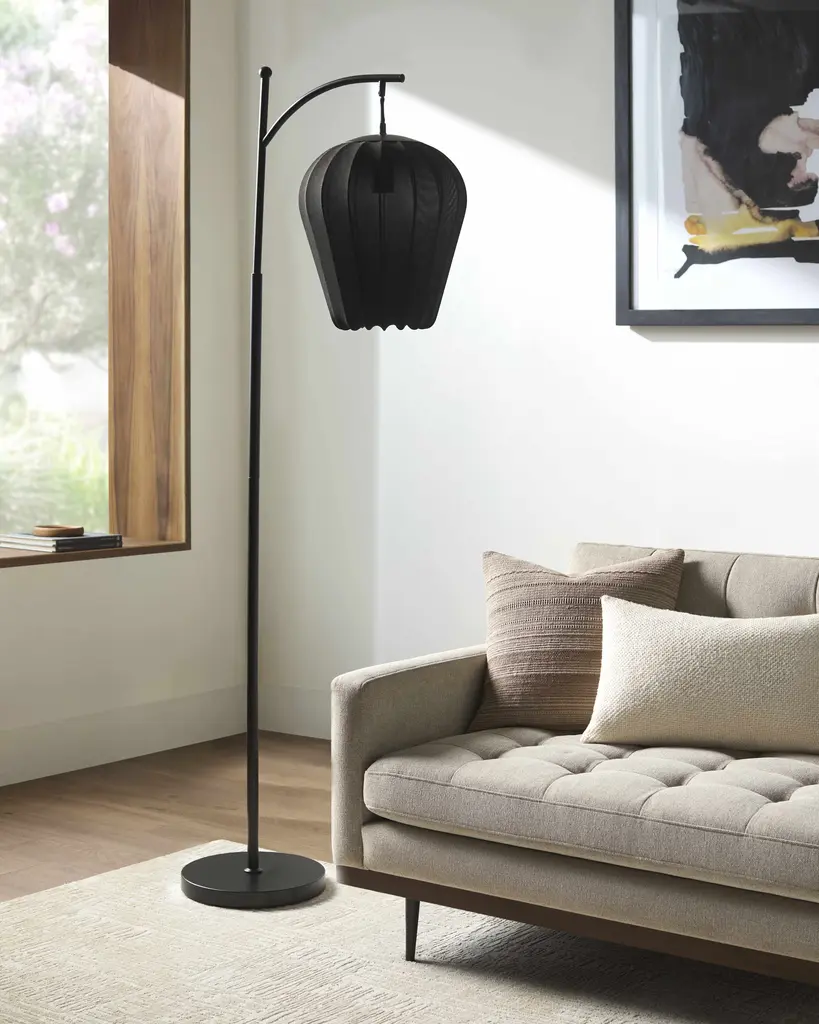 Collection: Cenotillo Colors: Black Material: Body: Iron / Base: Iron / Shade (Outside): Linen / Shade (Inside): Linen Styles: Contemporary Made In: China Lighting Type: Accent Floor Lighting Base: Iron Base Color: Black Shade Material: Linen Shade Color: Black Cord Length: 8' Switch Type: Foot Step Number of Bulbs: 1 Socket Type: E-26 Bulb Wattage: 100W