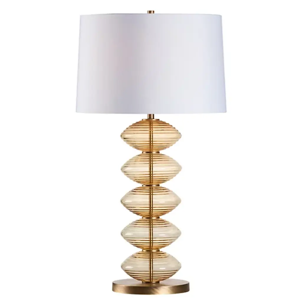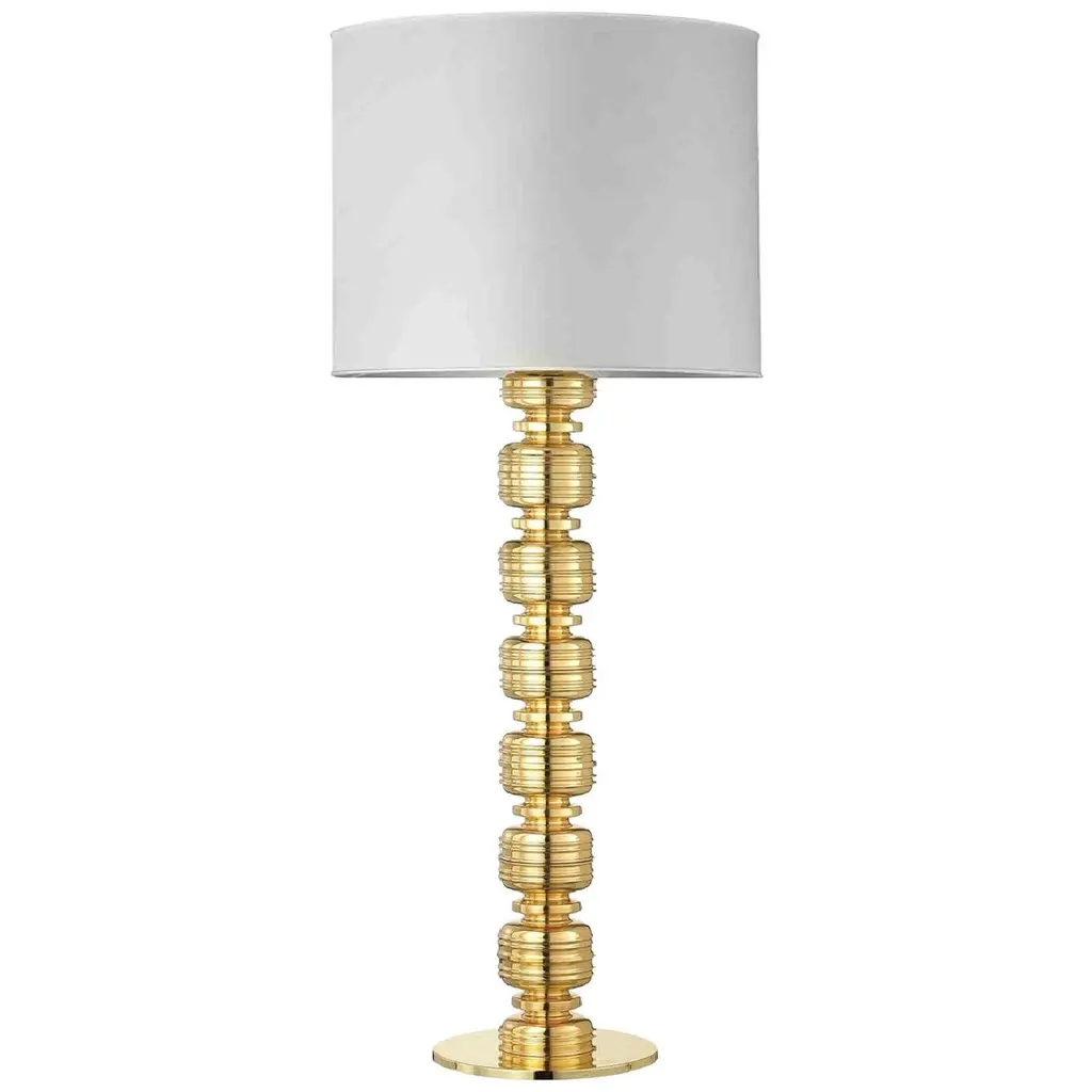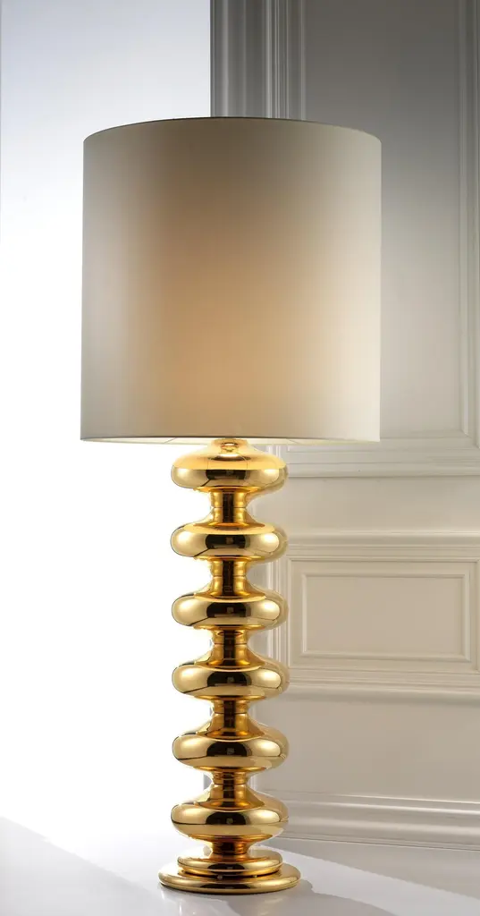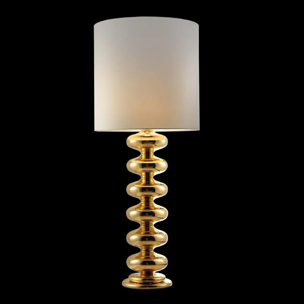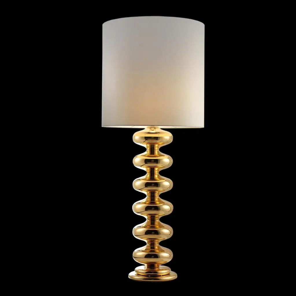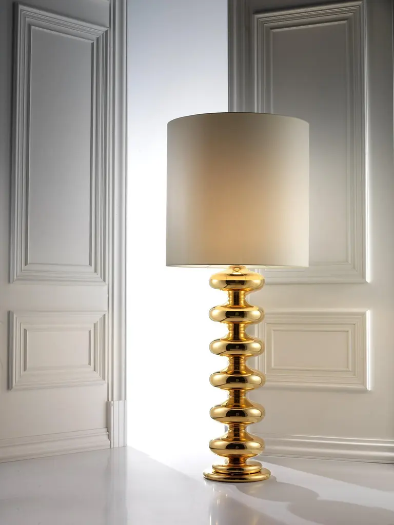 Ceramic lamp NIVES 3 handcrafted in 24-karat gold with cotton lampshadecod. NV003Measures: H. 150.0 cm. -Dm. 50.0 cm.