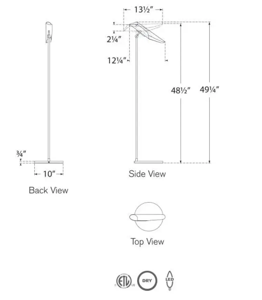 Flore Floor Lamp in Polished Nickel Designer: Champalimaud Height: 48.5" - 49.25" Extension: 12.25" - 13.5" Base: 10" Round Socket: E12 On/Off Toggle Wattage: 6.5 LED B11 Safety Rating Location: DRY Note: UL Only