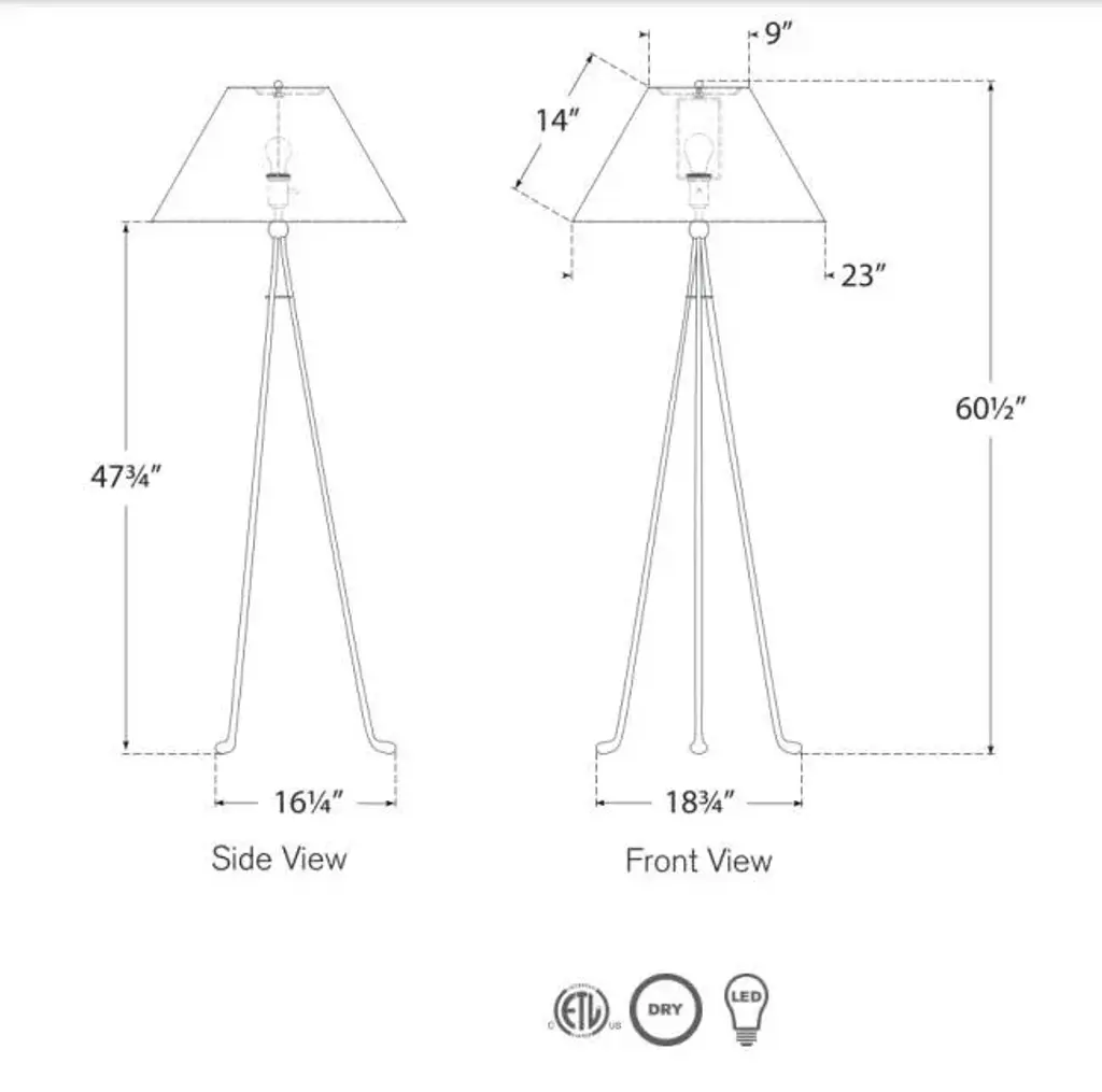 Valley Medium Tripod Floor Lamp in Aged Iron and Gild with Linen Shade Designer: Champalimaud Height: 60.5" Shade Detail: 9" x 23" x 14" Base: 18.75" Tripod Socket: E26 Dimmer Wattage: 15 LED A Safety Rating Location: DRY Note: UL Only