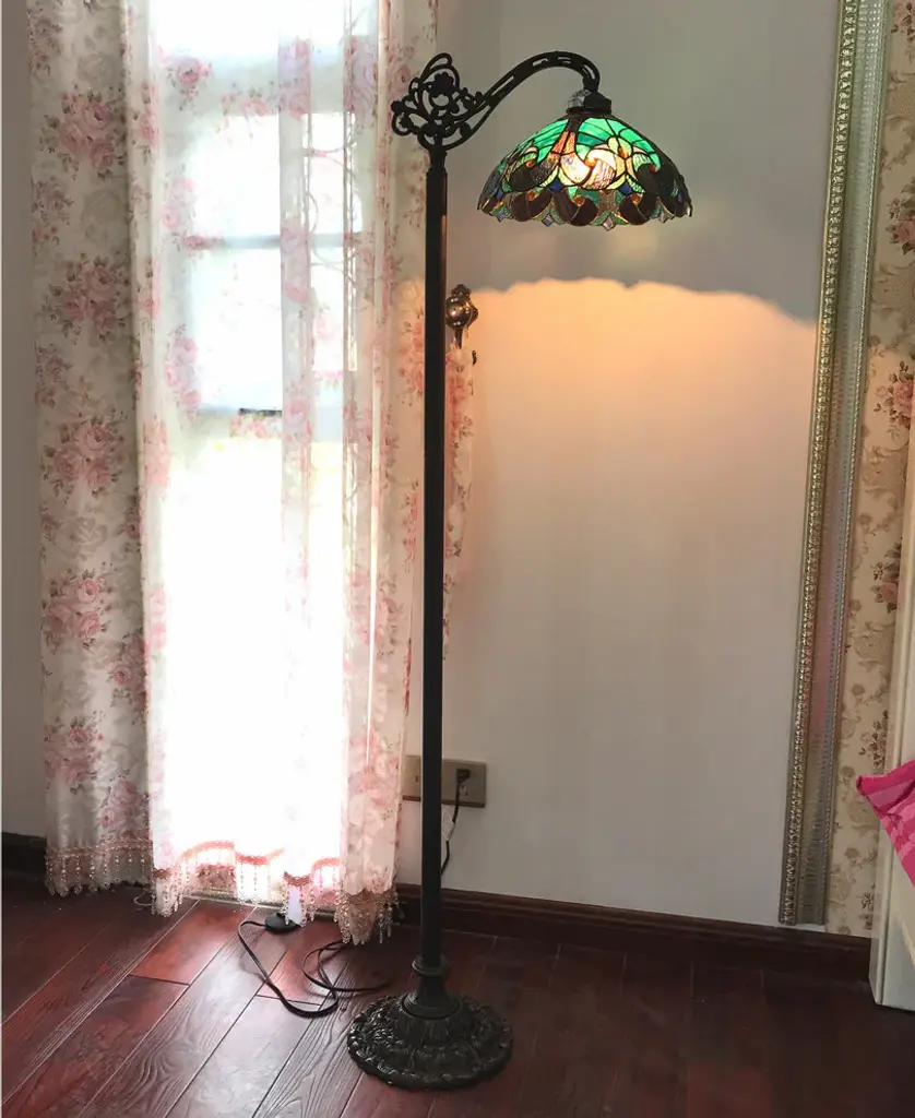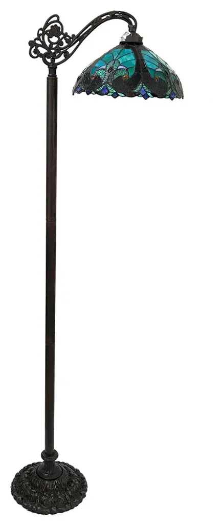 This Tiffany style 1-light floor lamp features a dark antique bronze finish that will complement many decors throughout your home. Hand crafted from over 220 pieces of art glass and 15 beads that will add color and beauty to any space. Main colors are blue, green, and brown. Handcrafted using the same techniques that were developed by Louis Comfort Tiffany in the early 1900s, this beautiful Tiffany-style piece contains hand-cut pieces of stained glass, each wrapped in fine copper foil.(1) 100 Watt max E26 Type A Bulb (not included) On-cord foot-stepper222pcs glass cut, 15 glass beadsDownlightIndoor SettingSince these are hand crafted products, the exact color of glass pieces may vary. Colors of the glass will appear darker and less vibrant when not illuminated. Handmade glass will vary from one piece to the other; glass made at different times will also vary. Light bulbs used in lamps or ambient lighting may affect the appearance of the products. Stained glass product has been protected with mineral oil as part of the finishing process. Please use a soft dry cloth to remove any excess oil.