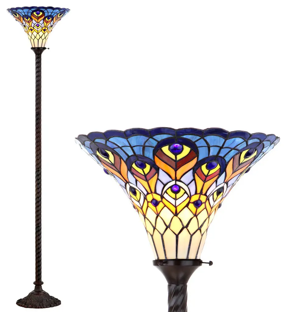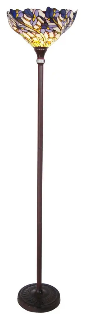 Iris design Tiffany style torchiere with bronze base and footstepper switch will be a beauty in your livingroom.(1) 100 Watt max E26 Type A Bulb (not included)Knob switch450pcs glass cut, 30 cabochonsUplightIndoor SettingHarmonized code: 940520Since these are hand crafted products, the exact color of glass pieces may vary. Colors of the glass will appear darker and less vibrant when not illuminated. Handmade glass will vary from one piece to the other; glass made at different times will also vary. Light bulbs used in lamps or ambient lighting may affect the appearance of the products. Stained glass product has been protected with mineral oil as part of the finishing process. Please use a soft dry cloth to remove any excess oil.