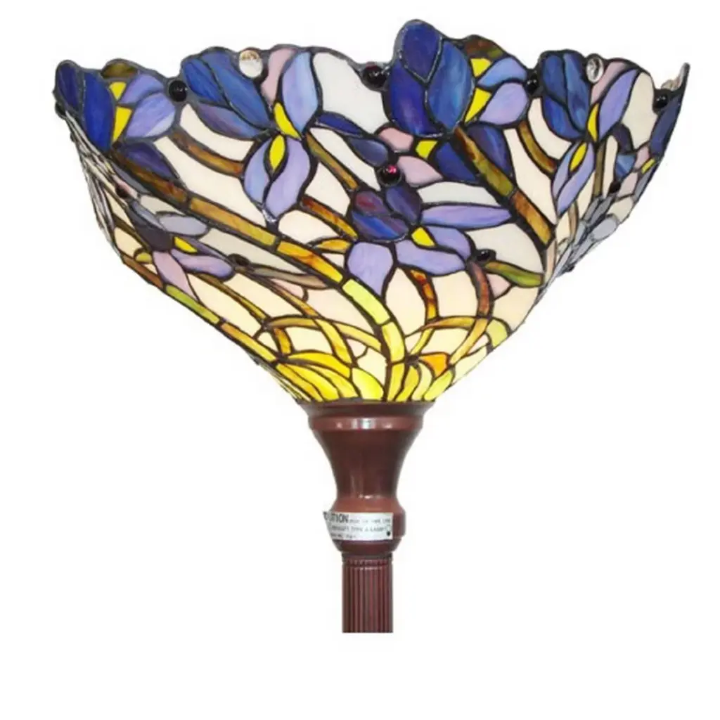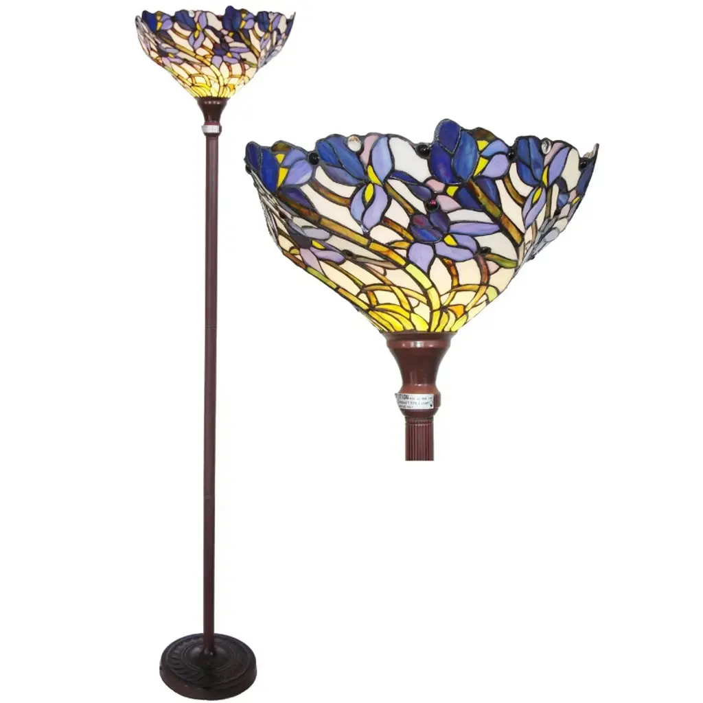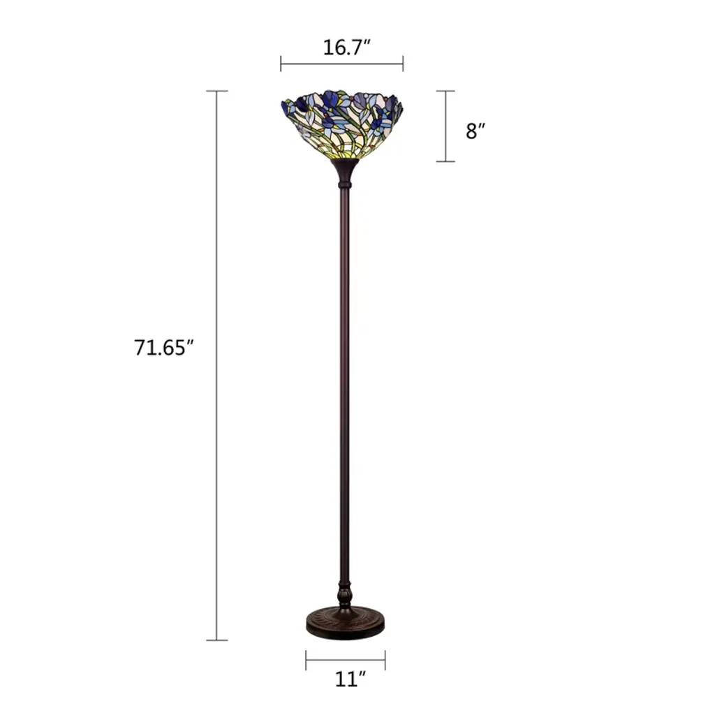 The Chloe Lighting 1-Light Tiffany-Style Iris Torchiere Floor Lamp features a 17-inch stained glass shade adorned with floral designs, creating a vibrant and artistic ambiance. Its slender metal body, finished in dark antique bronze, complements the colorful shade, making it a striking addition to various room styles. Key Specifications: Shade: 17" diameter, featuring 450 glass pieces and 30 beadsBulb: 1 x 100W max E26 Type A (not included)Switch: Knob switchWeight: Approximately 19 lbsFinish: Dark Antique BronzeDesign: Floral, UplightIndoor Use Only