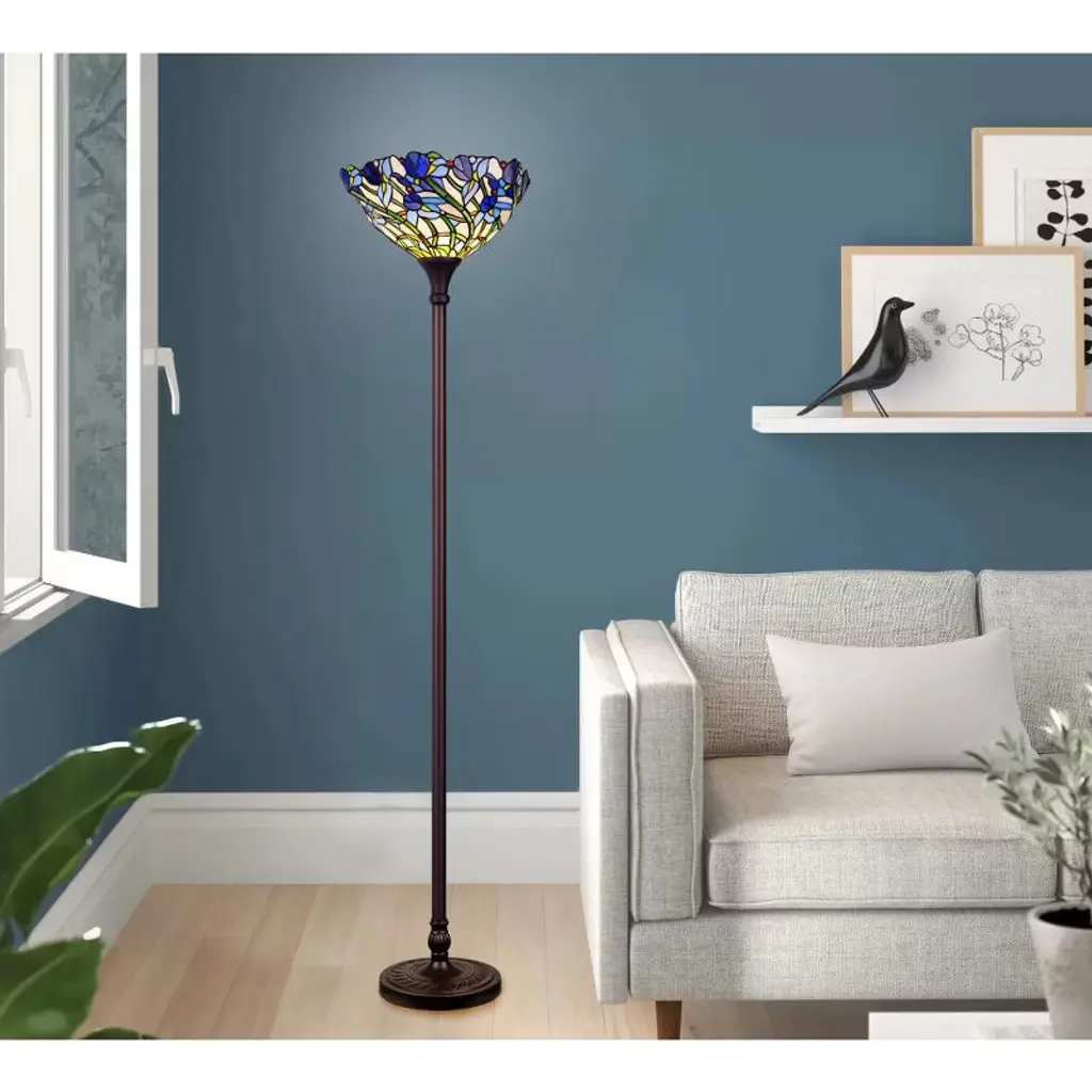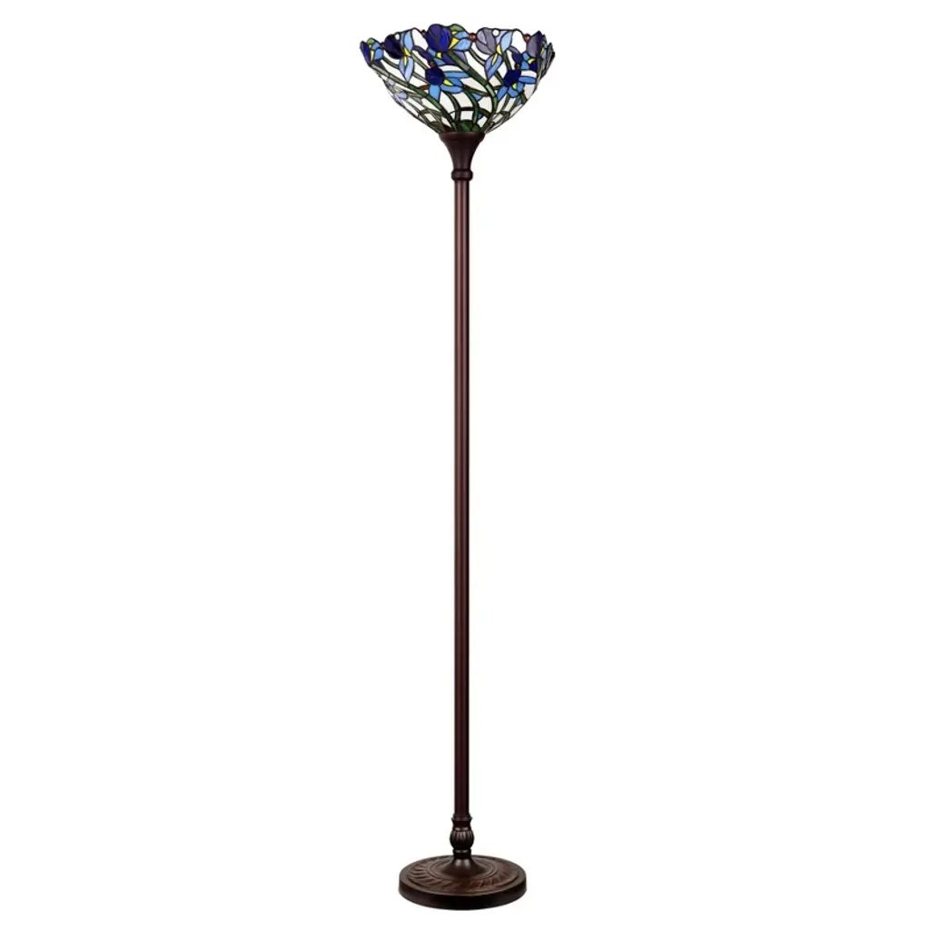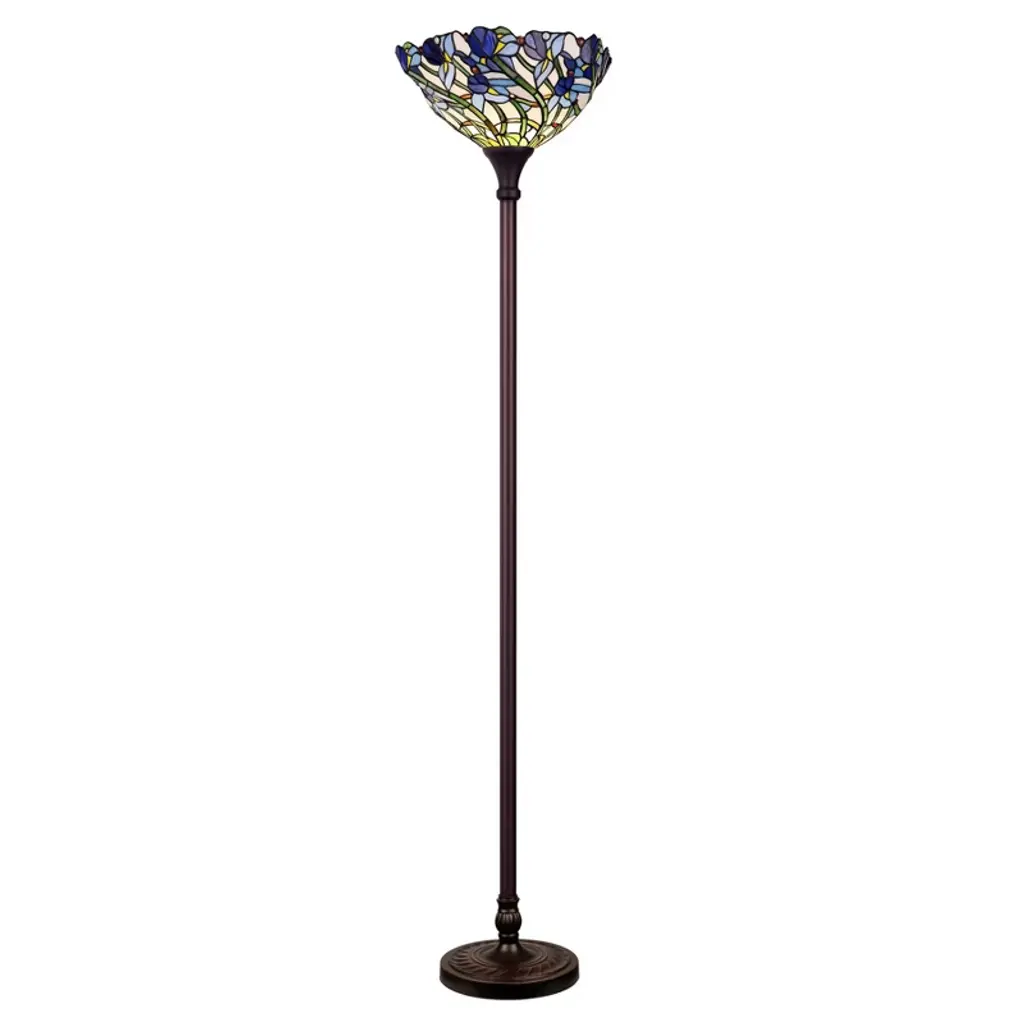 The Chloe Lighting 1-Light Tiffany-Style Iris Torchiere Floor Lamp features a 17-inch stained glass shade adorned with floral designs, creating a vibrant and artistic ambiance. Its slender metal body, finished in dark antique bronze, complements the colorful shade, making it a striking addition to various room styles. Key Specifications: Shade: 17" diameter, featuring 450 glass pieces and 30 beadsBulb: 1 x 100W max E26 Type A (not included)Switch: Knob switchWeight: Approximately 19 lbsFinish: Dark Antique BronzeDesign: Floral, UplightIndoor Use Only