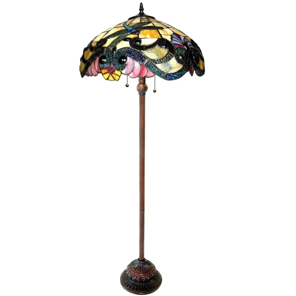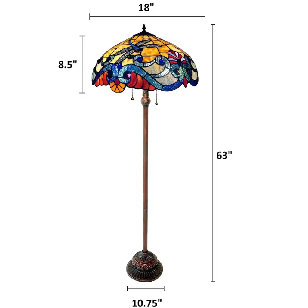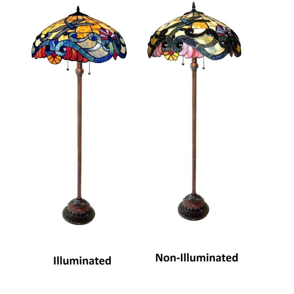 The Chloe Lighting is a Tiffany-style floor lamp featuring an 18-inch shade adorned with a classic dragonfly motif. This lamp stands 63 inches tall and is crafted from glass, resin, metal, and electrical components, all finished in a dark antique bronze patina. The shade is meticulously handcrafted with 340 pieces of stained glass and 42 decorative beads, creating a vibrant and intricate design. The lamp accommodates two 100-watt E26 Type A bulbs (not included) and operates with pull chain switches. It's designed for indoor use and is UL listed for safety.