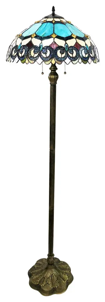 AUBREY, a Victorian style 2 light floor lamp features a classic look with an antique bronze finish. Hand crafted from over 370 pieces of art glass and 36 glass beads. Main colors are green and red. Handcrafted using the same techniques that were developed by Louis Comfort Tiffany in the early 1900s, this beautiful Tiffany-style piece contains hand-cut pieces of stained glass, each wrapped in fine copper foil.(2) 100 Watt max E26 Type A Bulb (not included)Pull Chain372 pieces glass cut, 36 glass beadsDownlightIndoor SettingBulb Type ANumber of Bulbs 2Bulbs Included ? NoO3Bulb Wattage 100W