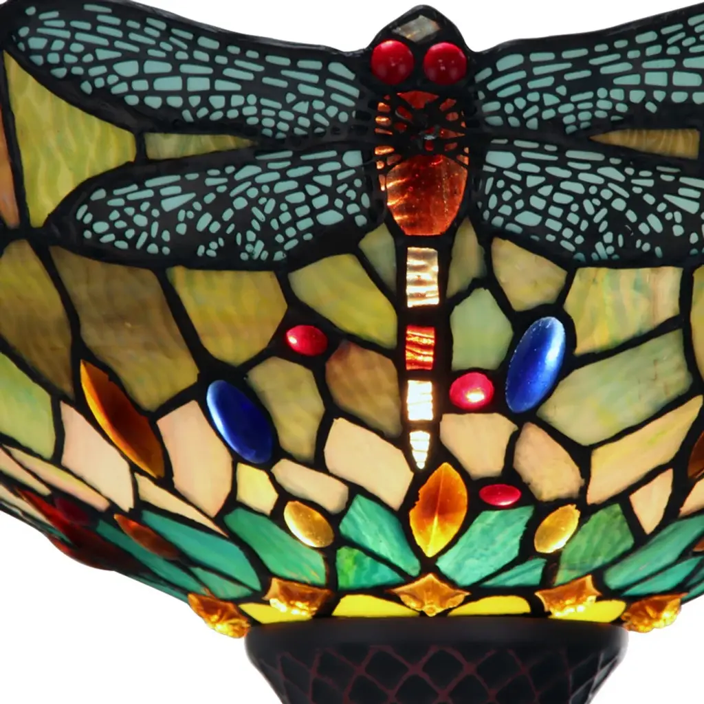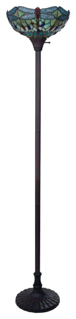 EMPRESS, a 1-light Dragonfly torchiere floor lamp, will make a design statement by itself. Hand crafted from individually hand cut pieces of art glass that will add color and beauty to any space. Main colors are beige and green. Handcrafted using the same techniques that were developed by Louis Comfort Tiffany in the early 1900s, this beautiful Tiffany-style piece contains 220 hand-cut pieces of stained glass, 45 glass beads and 20 glass crystals, each wrapped in fine copper foil. This fixture is compatible with flourescent, incandescent, and LED bulbs. UL Listed, Dry listed and recommended for an indoor setting only.