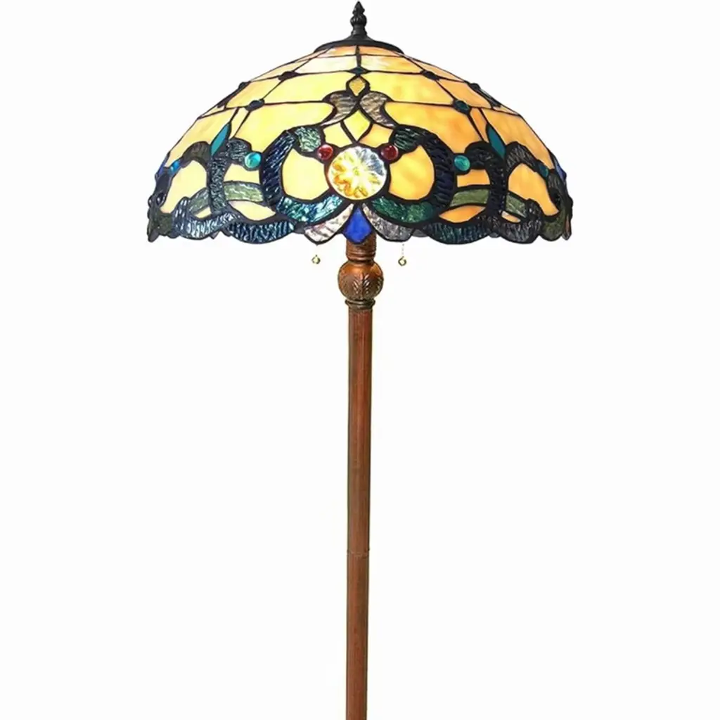 Enhance your home’s ambiance with the timeless beauty of the Doutzen Victorian Tiffany-style floor lamp. Showcasing an ornate 18-inch shade composed of 341 hand-cut stained glass pieces and 36 jewel-like beads, this lamp delivers a rich interplay of color and light. The graceful silhouette and dark antique bronze finish make it a refined addition to any traditional or transitional setting. Key Features: Victorian-inspired design with 341 hand-cut stained glass pieces and 36 decorative beads Sturdy resin base with elegant dark antique bronze finish Pull chain switches for dual bulb control and ambient lighting Requires (2) 100W max E26 Type A bulbs (not included) Dimensions: 63" H x 18" W | Shade Height: 8.5" | Base Width: 10.75" | Net Weight: 16 lbs
