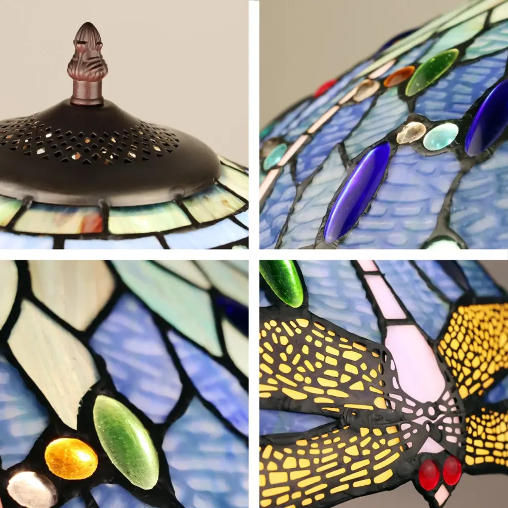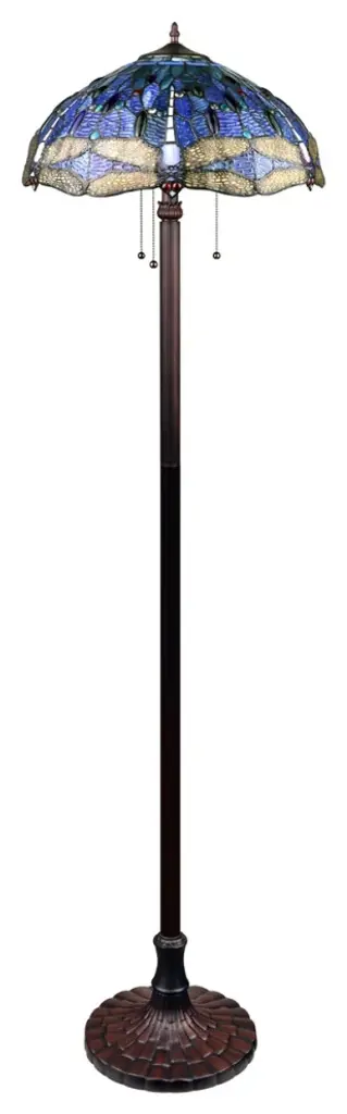 This is a Dragonfly design 3 light, style floor lamp that would be a perfect fit in a bedroom, office and livingroom! The shade is hand-crafted This process entails using 264 hand cut stained art glass pieces and 96 glass beads, each wrapped in fine copper foil and soldered together at extremely high temperatures to form each unique piece. Exact size to the nearest inch may vary, and exact color of each glass piece may vary due to each piece being hand crafted. First image is with the light shining through, second image is with no light. Dry listed and recommended for an indoor setting.Features: • Materials: Glass, resin, metal, electrical components • Finish: Multi-Color • (3) 100 Watt max E26 Type A Bulbs (not included) • Pull chain • 264 pcs glass cut, 96 glass beads • Type: Downlight • Indoor Setting • Base color: Dark BronzeSpecifications: • Product Dimensions: 64.76"H x 18"W x 18"D • Product Weight: 16.09 lbs • Number of Lights: 3